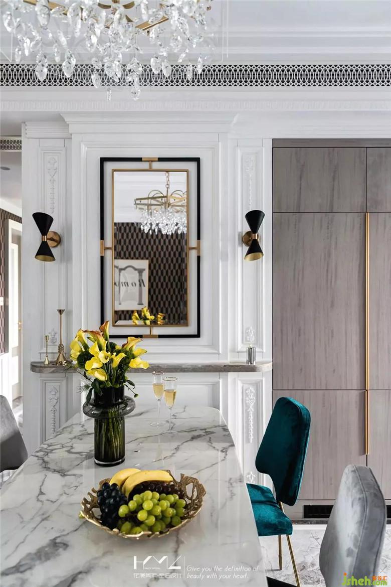 餐廳是整屋的中廳,整體想營造古典輕奢復古風,在主背景上,運用帽頭,上下護墻分割,雕花,對稱黑金壁燈,金色框裝飾鏡這些元素揉搓融合,再結合水晶吊燈,石膏美式線條等一系列經典美式元素,框出餐廳唯美動人的輕奢風采。