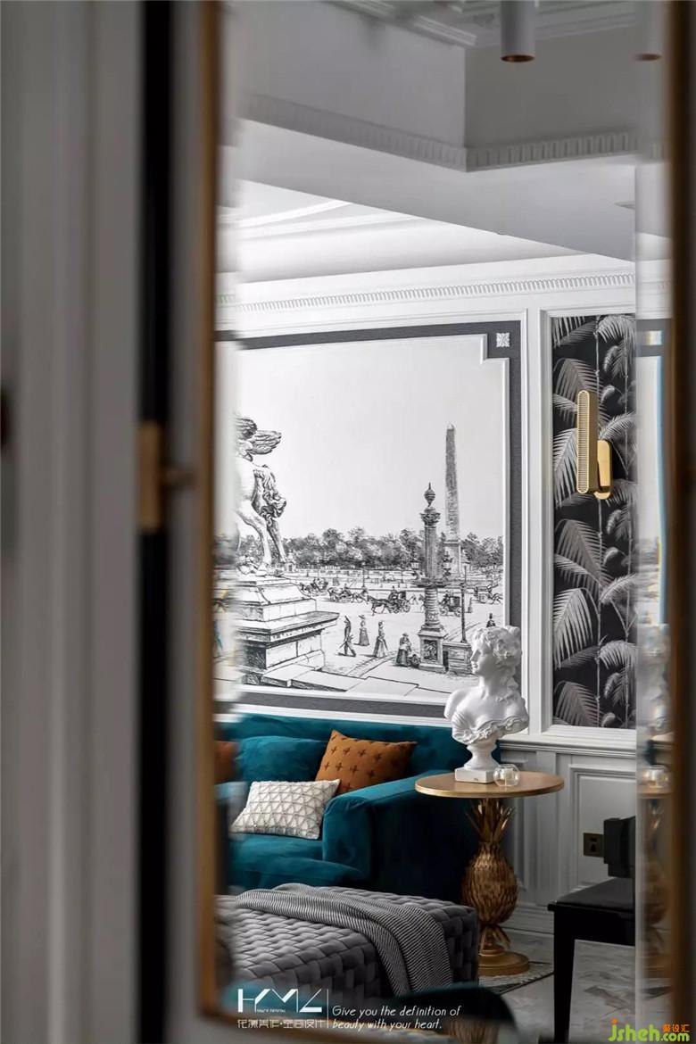 客廳延續(xù)古典輕奢復古風,背景墻線條分隔造型,也是延續(xù)了餐廳的屬性,主背景增加壁畫與壁紙的組合,營造出復古莊重與空間細膩質(zhì)感。