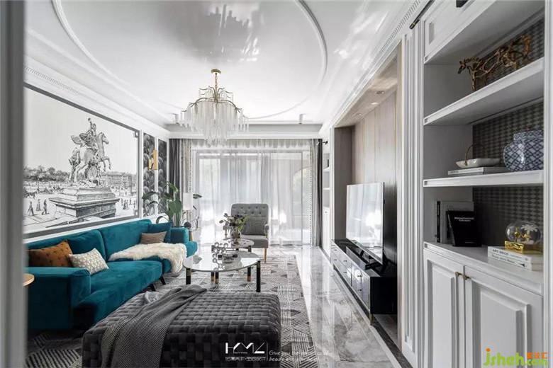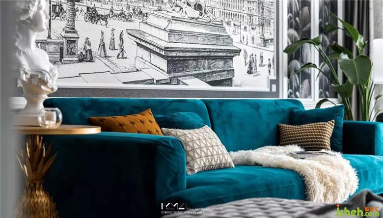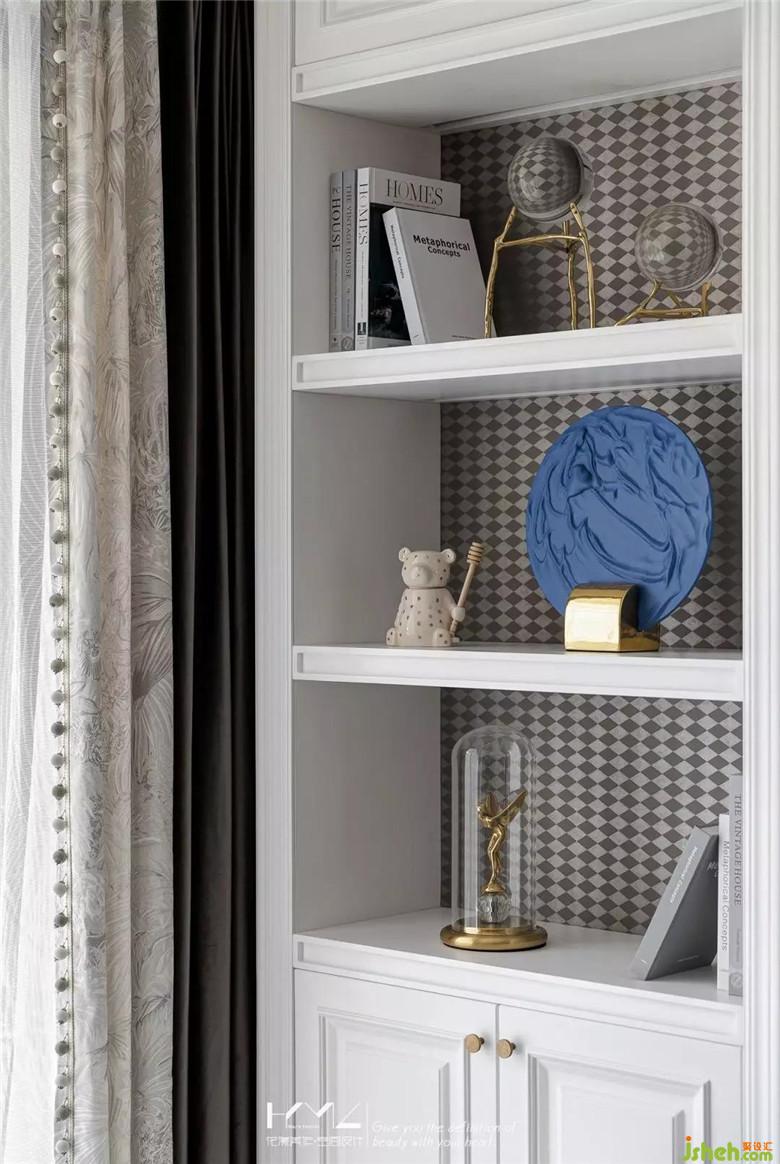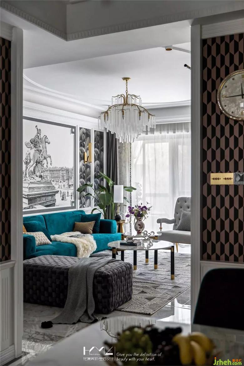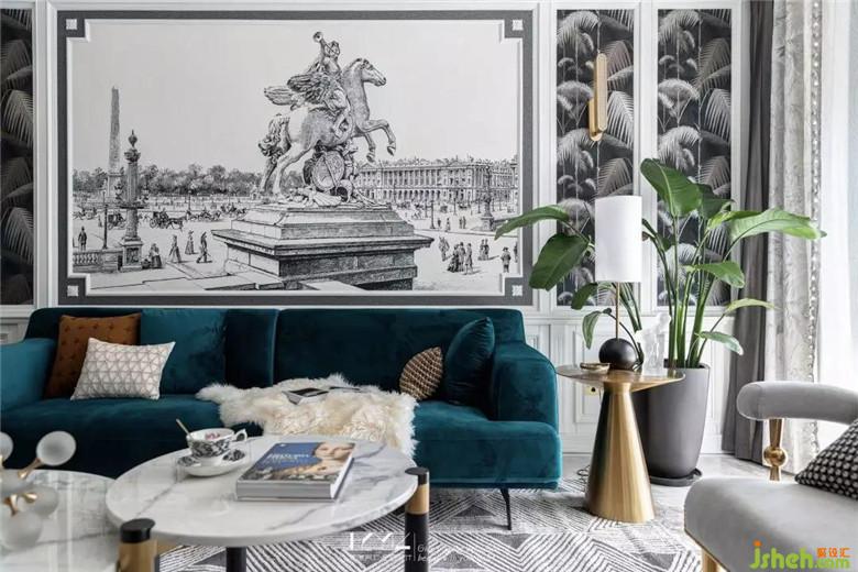 左邊是復古造型的金色邊幾,平衡呼應,編織款式的長條落地榻凳選用深灰絨,結(jié)合地面三角幾何拼接的地毯紋理,無一細節(jié)不體現(xiàn)美式與現(xiàn)代、繁復與簡約的彼此融合。