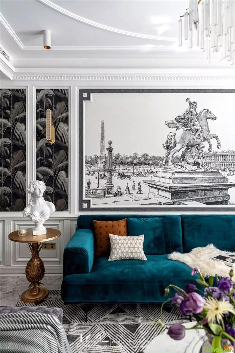 兩邊壁紙是英國cole&son的棕櫚葉系列,型號是95-1004,中間背景畫是一副名為《雕像》的壁畫,古老建筑物中風雨侵蝕的雕像,意在傳遞一種永恒的精神,這也符合一個家的精神追求;流蘇水晶燈與頂面層次疊起的石膏線條豐富空間細膩層次,在主體家具的選型上,偏向現(xiàn)代風格,意在詮釋混搭的意義,同時呈現(xiàn)中西合璧的折中主義精神。