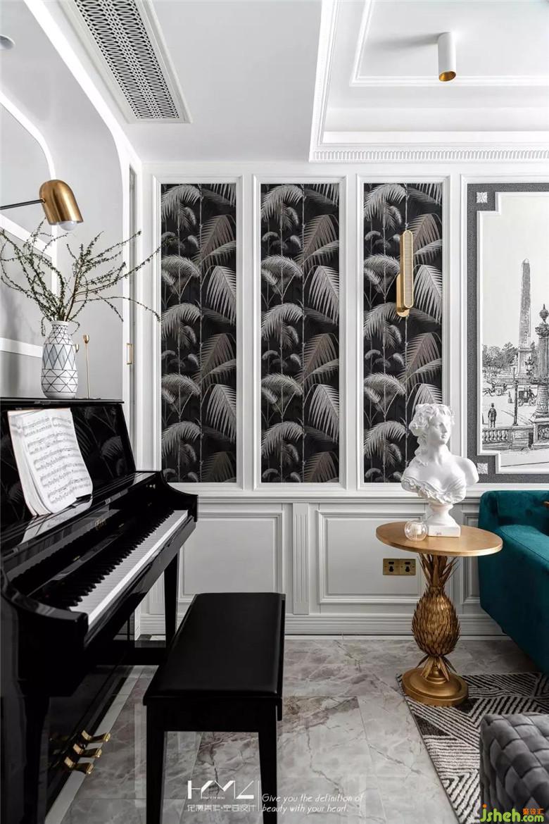 客廳一側(cè)是女兒的鋼琴區(qū),中間是弧形九宮格的灰白分格,兩側(cè)是藝術玻璃展示酒柜,厚度與鋼琴幾乎齊平,讓鋼琴區(qū)很好的融合到整個客餐廳的主體當中。裝修公司