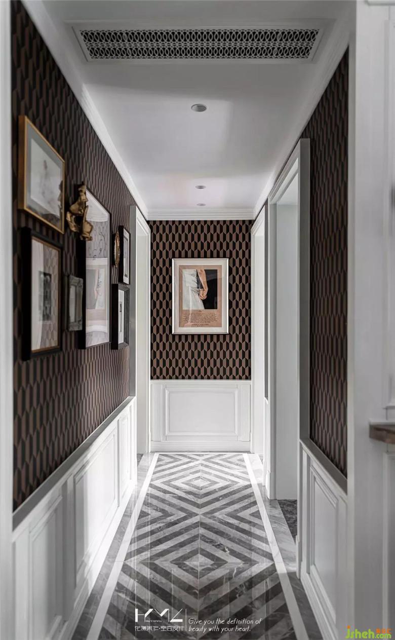 過道下墻裙白色護(hù)墻板從客廳從餐廳延伸過來,上部分是英國cole&son的幾何系列壁紙,地面拼花迎合了門廳的拼貼,運(yùn)用雙色菱形的延伸,讓空間擴(kuò)容。