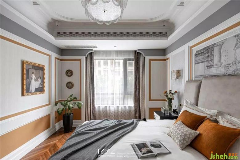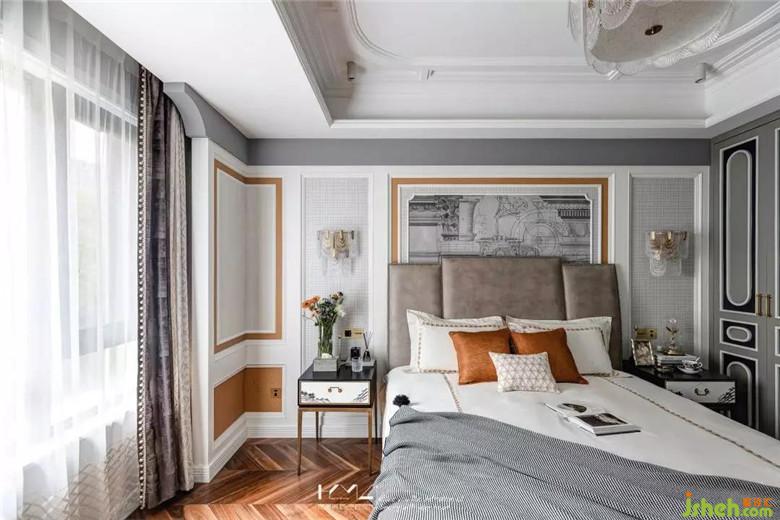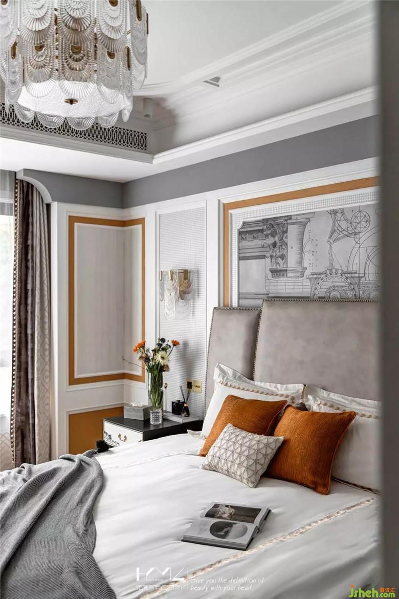 主臥整體理念是優(yōu)雅,尊貴,以淺灰奶白為主色調(diào),局部點綴橙色,褐色,深灰,地面均選用深胡桃木實木魚骨地板,墻面主體造型是分三個層次,外框是實木奶白烤漆護(hù)墻板,內(nèi)框pu線條,選用橙色紋理,千鳥格,香檳色素紋,以及古建筑手稿的背景壁畫等四款壁紙組合布置,形式和配色讓空間更加立體,層次更加豐富,細(xì)膩質(zhì)感將優(yōu)雅尊貴氣質(zhì)體現(xiàn)的淋漓盡致。