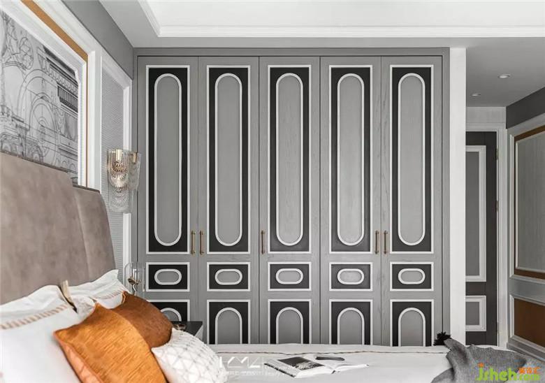 主臥衣柜柜門,與房門設(shè)計分割異曲同工,不過,柜門配色以重色為主,白色框線點綴,融合圓弧元素設(shè)計其中,彰顯沉穩(wěn)氣質(zhì)。