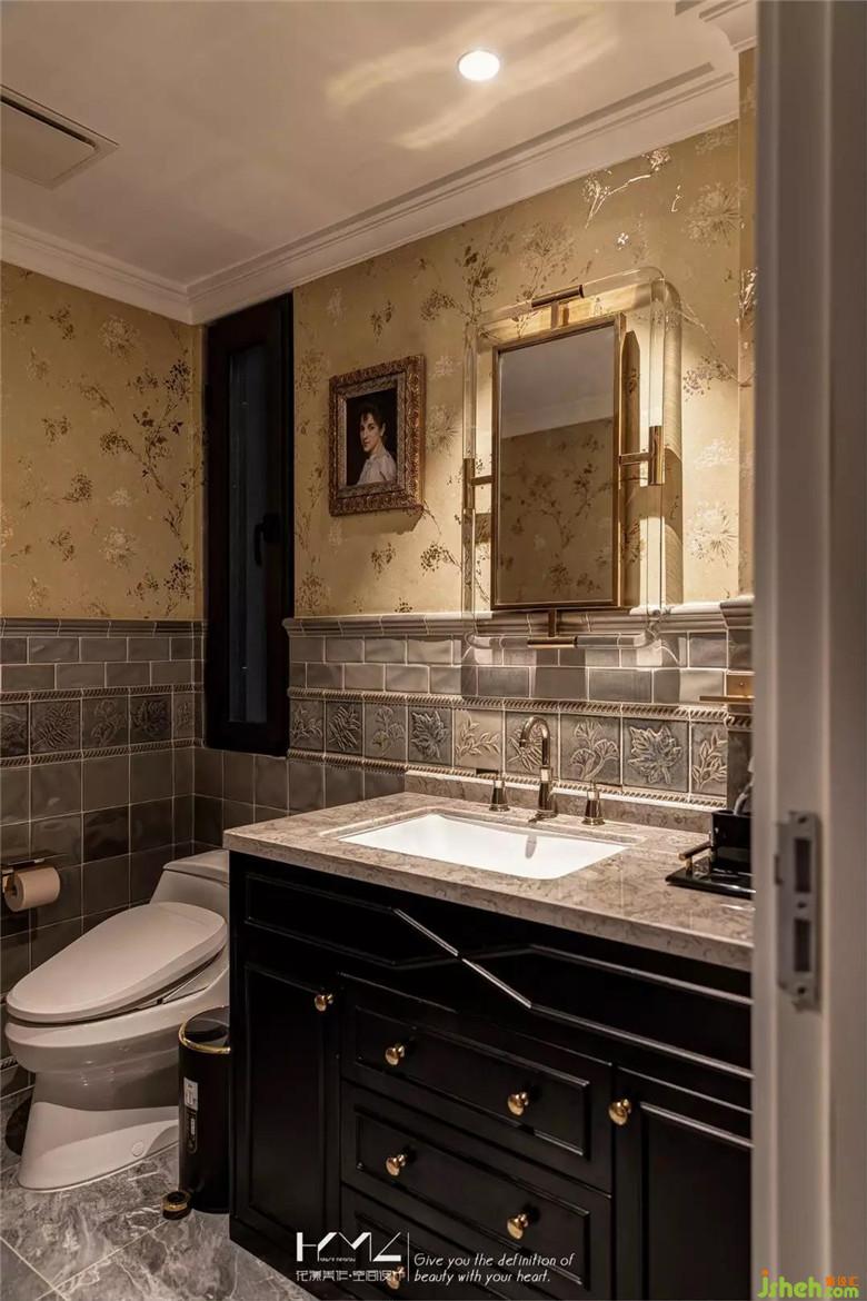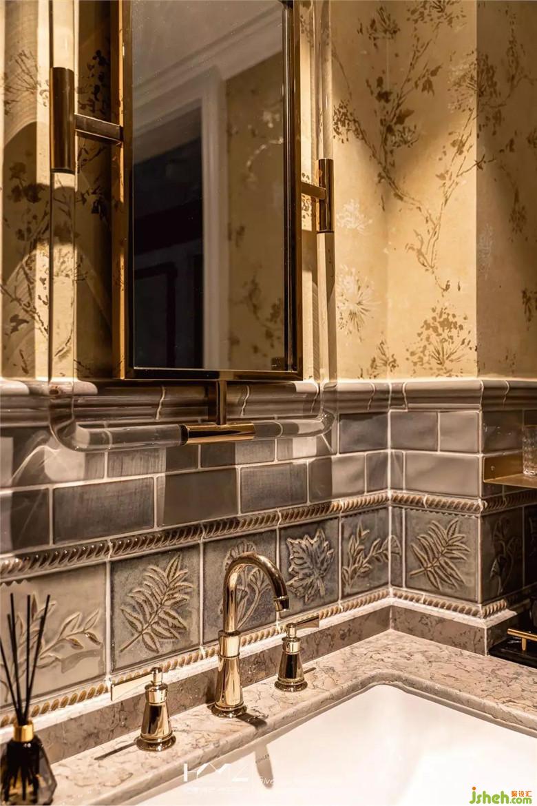 主衛(wèi)的設(shè)計,根據(jù)業(yè)主要求,沒有設(shè)置淋浴功能,地面裝修公司選用深灰色系的磚與半墻仿古拼花磚搭配,上半部分,搭配香檳色系花紋墻紙,枝葉都是金箔反光質(zhì)感,讓主衛(wèi)空間融入整體,弱化了常規(guī)衛(wèi)生間的冰冷感。