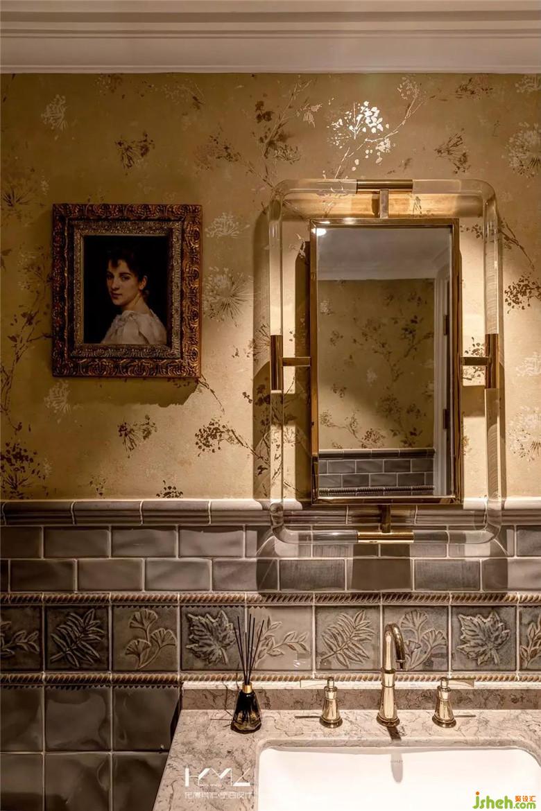 墻面采用上下分色形式,下墻面選用了水磨石紋理粉色壁紙,占比多,上墻面與客廳灰色菱形壁紙呼應(yīng),英國(guó)cole&son的現(xiàn)代款,型號(hào)是103/14057,中間是兩條pu線條,漆成黑色。