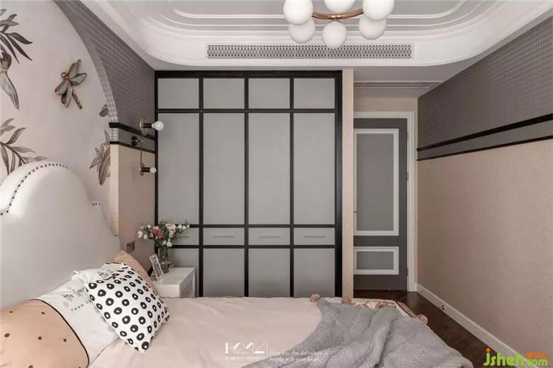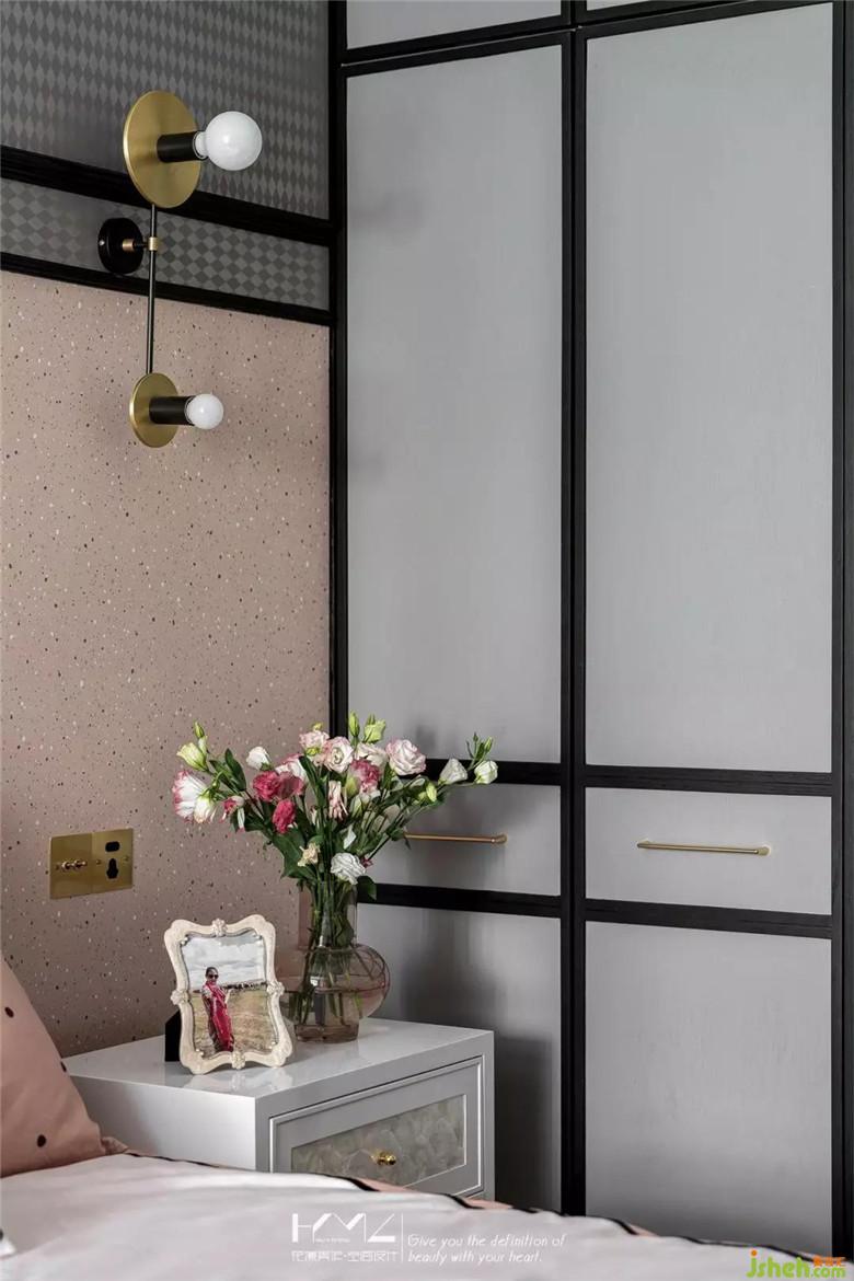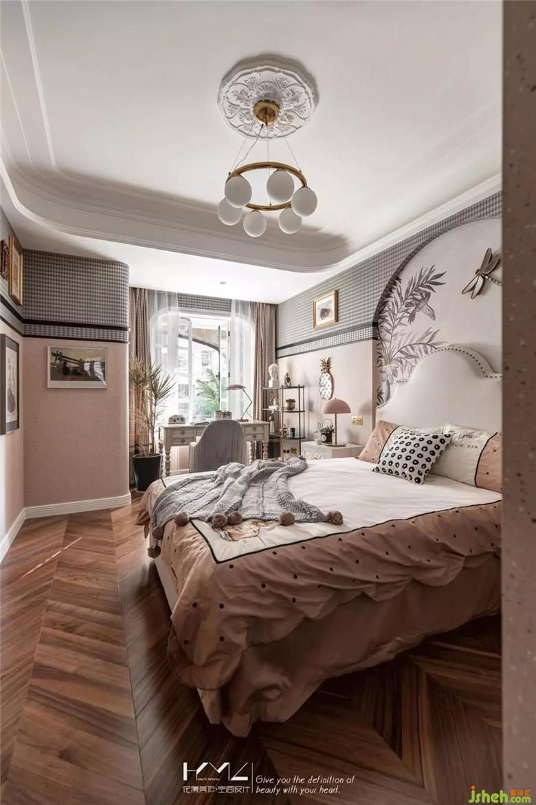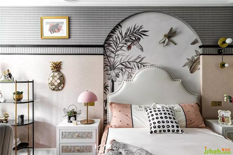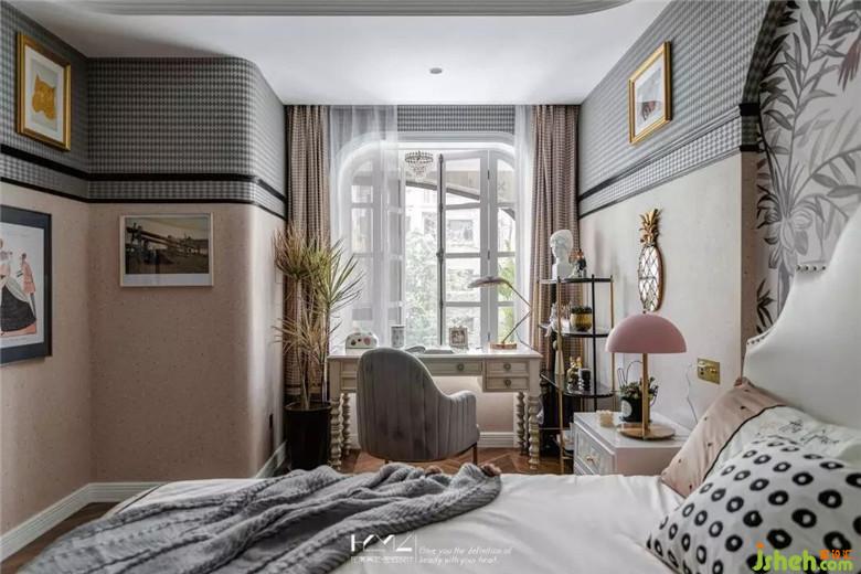 女兒房風(fēng)格定位偏向田園美式,因?yàn)榕畠簞偵咧?,正直青春洋溢的年齡,所以裝修公司在色彩定位上以少女都喜愛(ài)的淺粉色做主色調(diào),淺灰壁紙做配色,黑框線條做點(diǎn)綴,整體體現(xiàn)一種輕熟少女的味道。