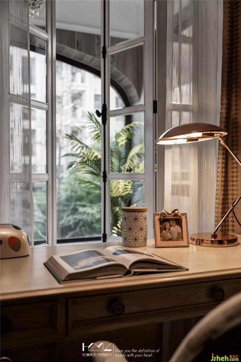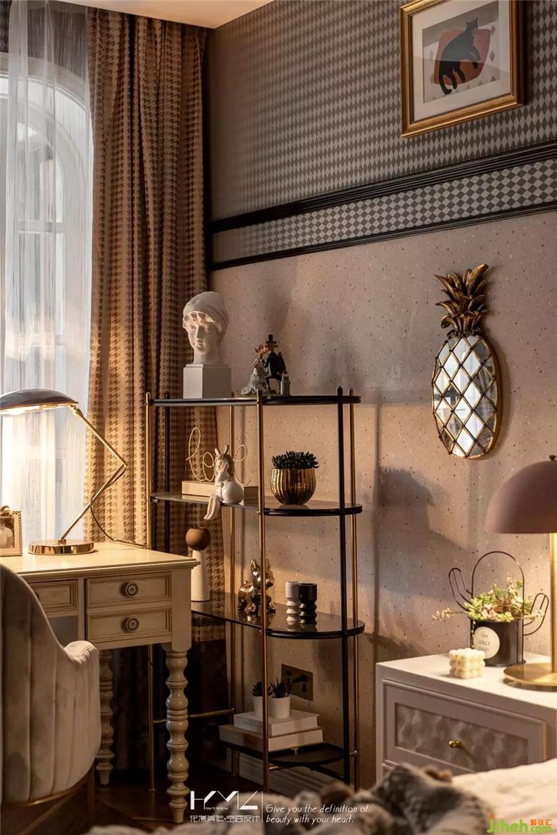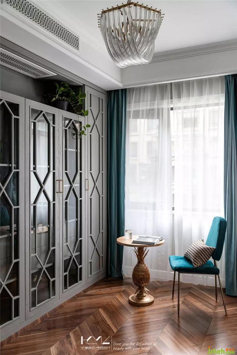 書(shū)房功能上當(dāng)做藏書(shū)與儲(chǔ)存空間存在,利用L型結(jié)構(gòu)特點(diǎn),圍合出衣帽柜和書(shū)柜組合,全部灰色顯紋烤漆飾面,柜門設(shè)計(jì)了菱形凹凸造型,衣柜與書(shū)柜利用中間鏤玻璃區(qū)分,上方的空調(diào)風(fēng)口,利用柜體設(shè)計(jì),將回風(fēng)口置于書(shū)柜上方,簡(jiǎn)約水晶吊燈,與藍(lán)色絲絨窗簾營(yíng)造輕奢氛圍。