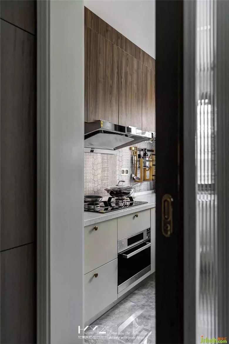 廚房呈現(xiàn)現(xiàn)代風(fēng)格,吊柜深胡桃木平板門顏色與整屋的魚(yú)骨地板類似,配亞克力把手,下柜是奶白色烤漆門板,金色把手點(diǎn)綴,灶臺(tái)的背景磚選了四色混拼花紋長(zhǎng)條磚,與南陽(yáng)臺(tái)同系列,地磚與主衛(wèi)地磚同款,廚房?jī)?nèi)的五金掛件都是黑金色,所有軟裝的選擇都透露著精致的小心思。裝修公司