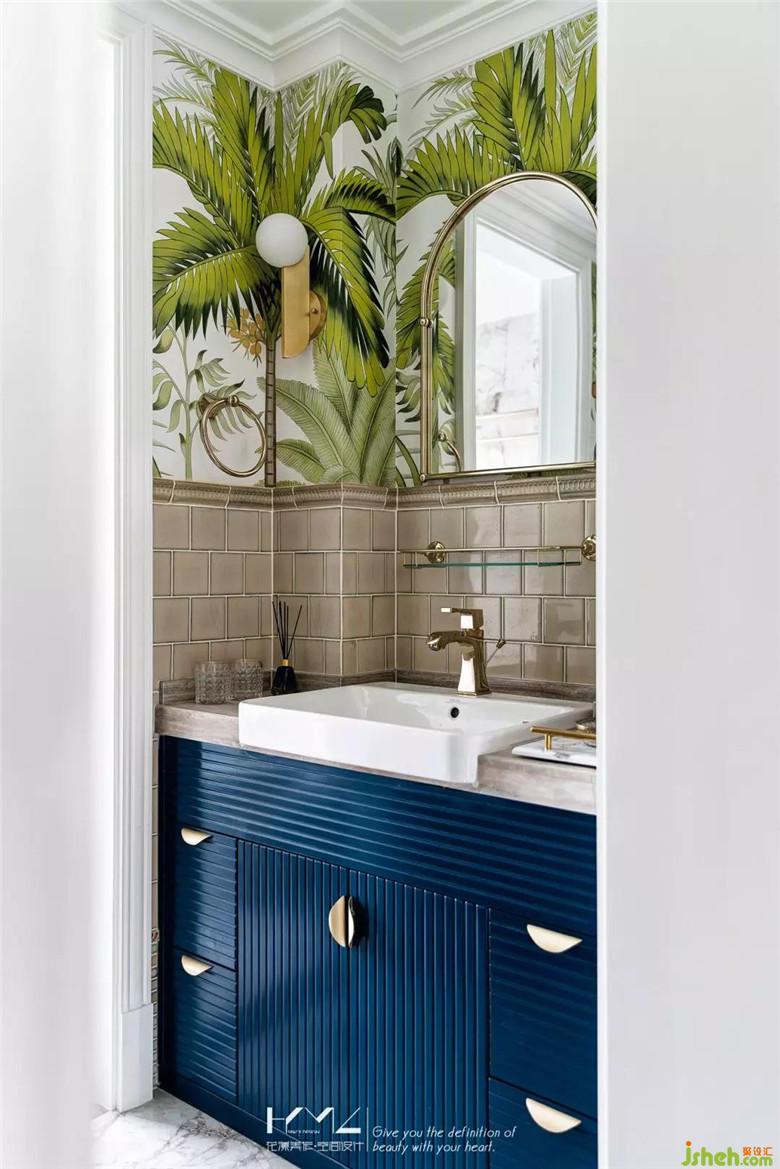 上部分是綠色系的花鳥(niǎo)壁紙,柜體特意調(diào)了藏藍(lán)色烤漆門板,橫向豎向的抽縫紋理讓柜門顯得獨(dú)特雅致,半圓的金色把手可愛(ài)又獨(dú)特,兩邊是金色白球壁燈。