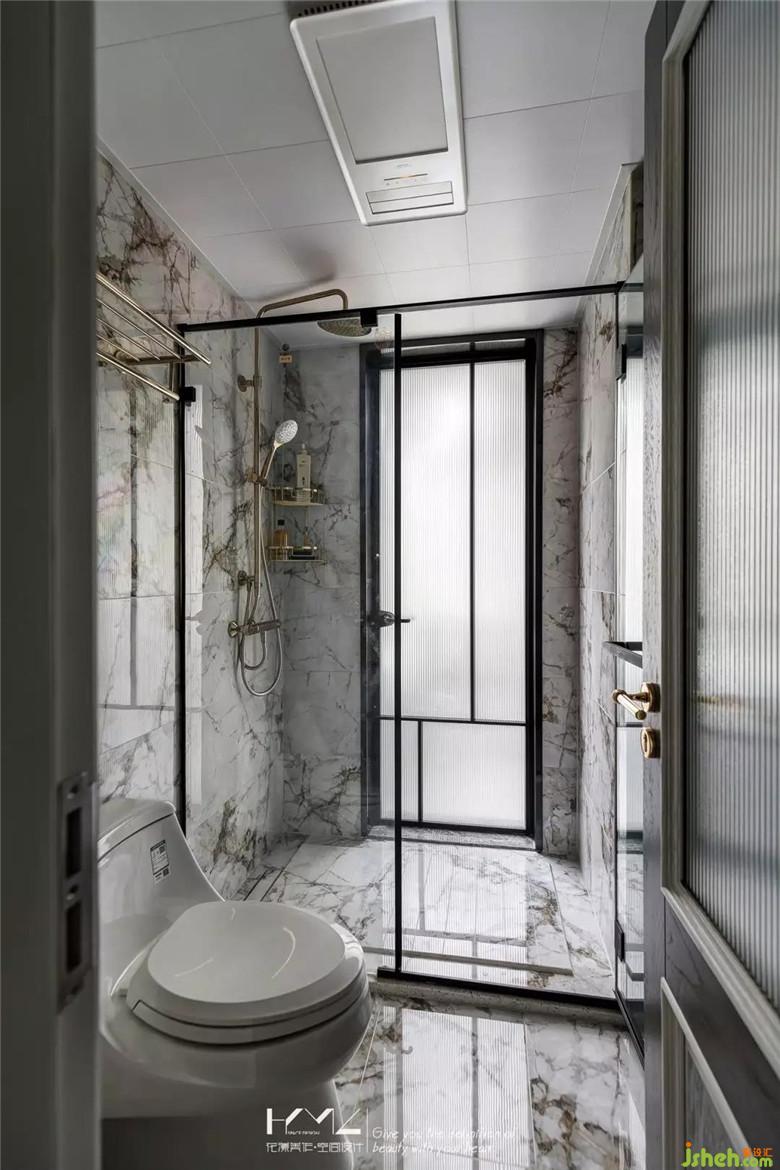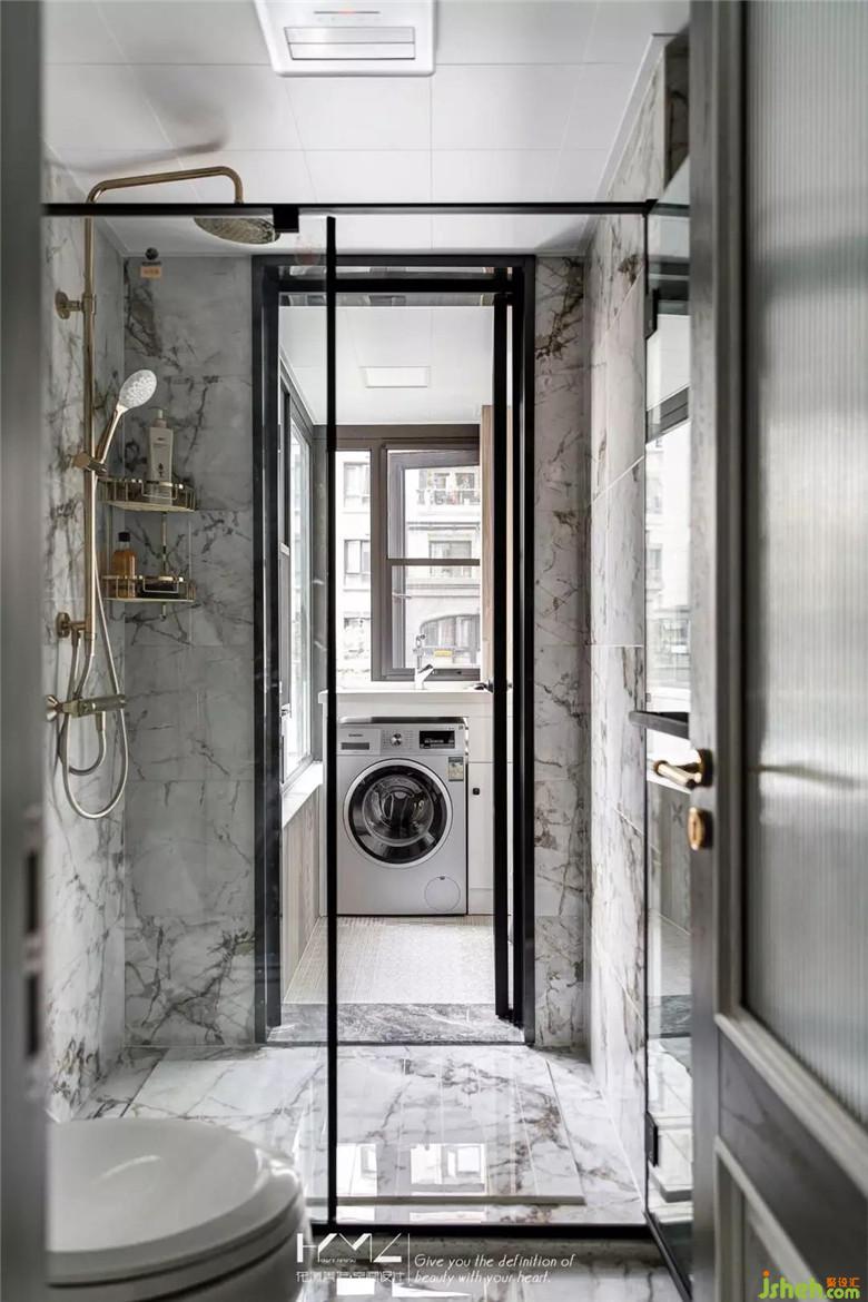 所有的五金延續(xù)了其他空間的香檳金色,貴氣典雅,細(xì)黑框的長(zhǎng)虹玻璃門也是定制,外面就是我們加出來(lái)的洗衣房,吊頂均采用啞光集成吊頂,簡(jiǎn)潔易打理。裝修公司