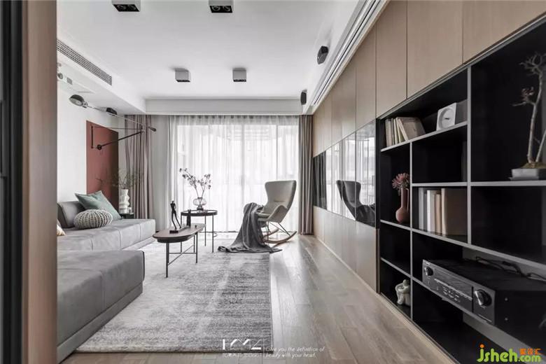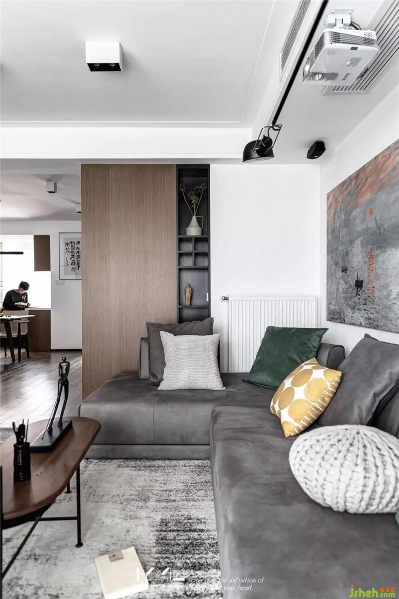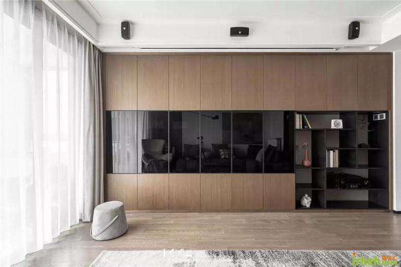 屋主一直有讀書的習慣,希望能營造家庭讀書的氛圍,而客廳是整個家最核心的區(qū)域,讀書、藏書的功能在這個區(qū)域可以發(fā)揮的淋漓盡致。投影幕布代替電視機,釋放柜體空間,整排書柜既實現(xiàn)了書籍的放置,裝修公司也解決了收納的問題。書柜的木質柜門仿照KD板的顏色和木紋做油漆門,反復調色確認,盡可能縮小色差,統(tǒng)一木色。