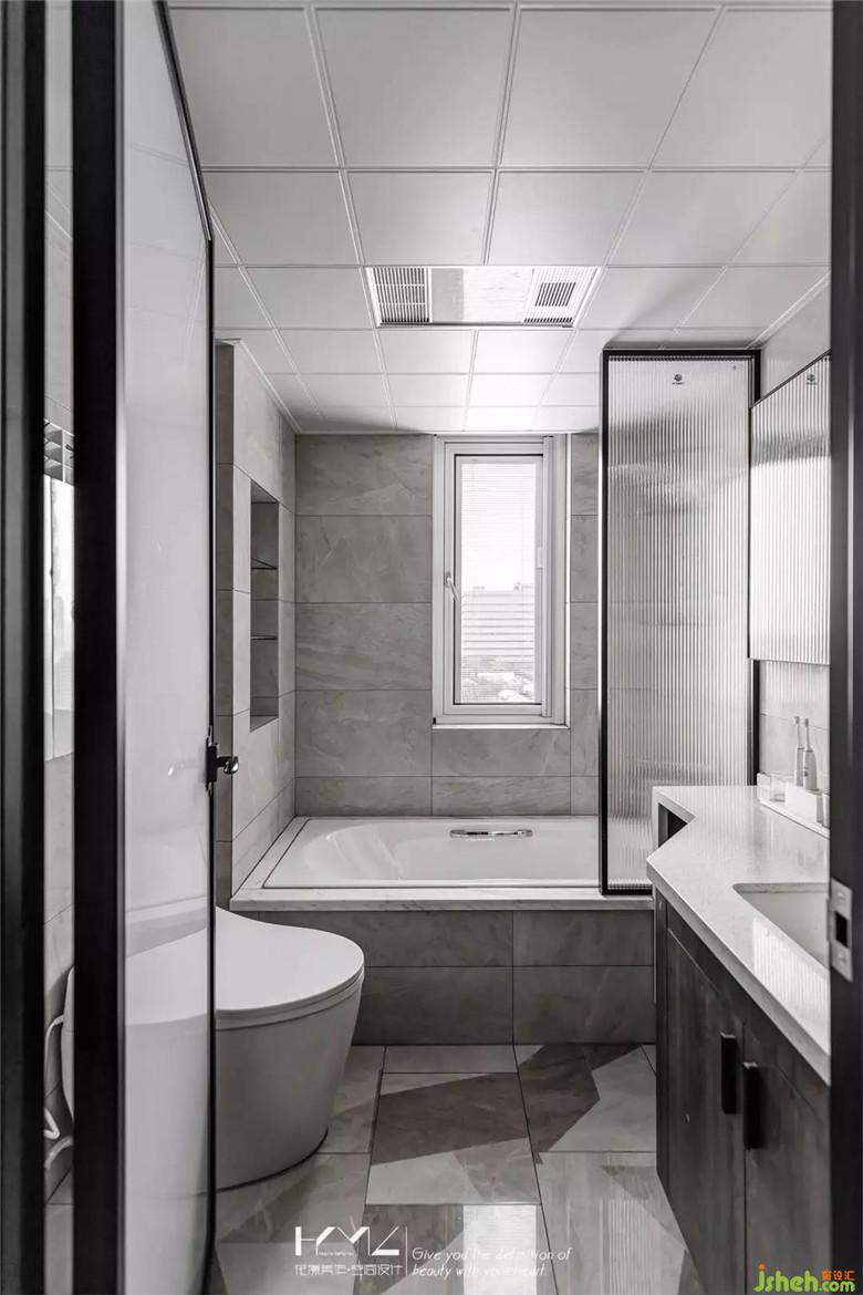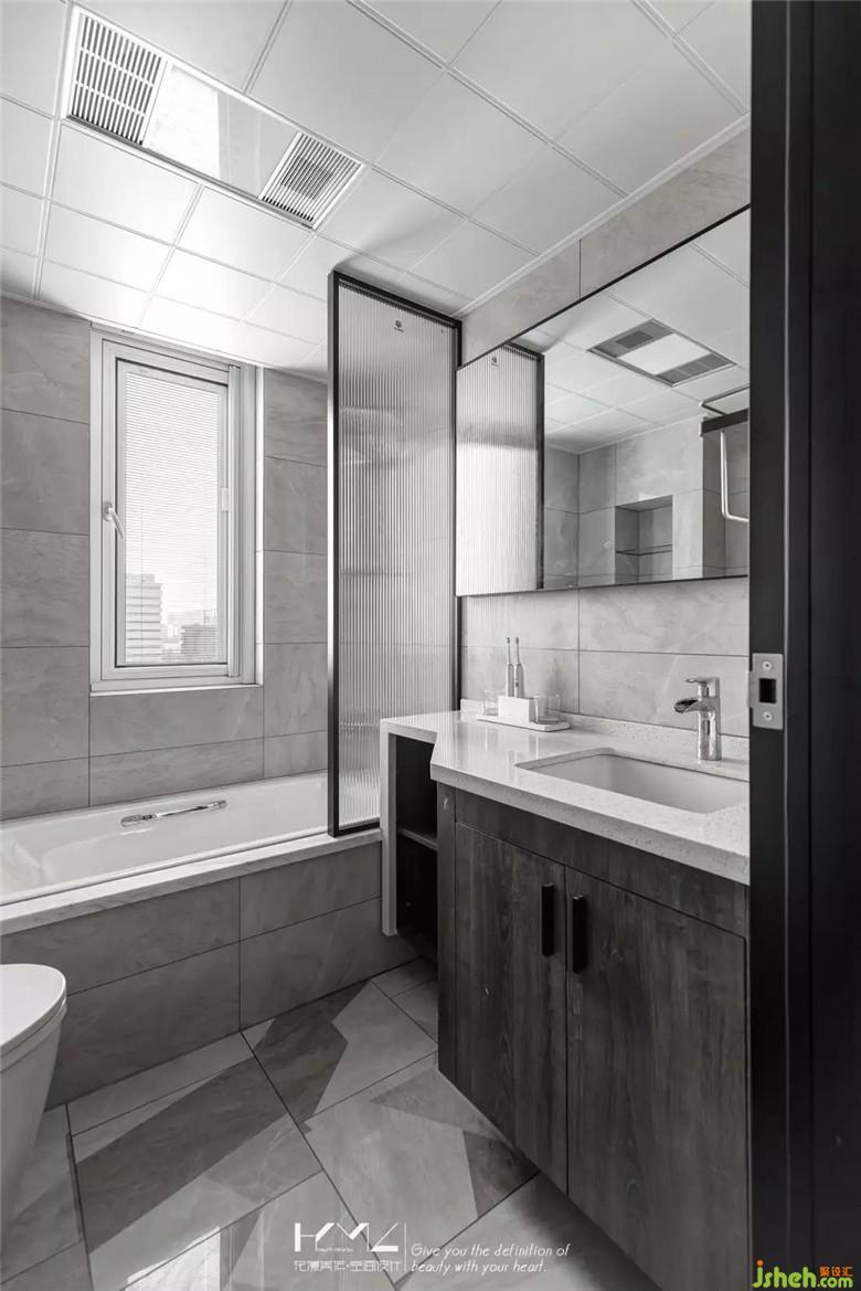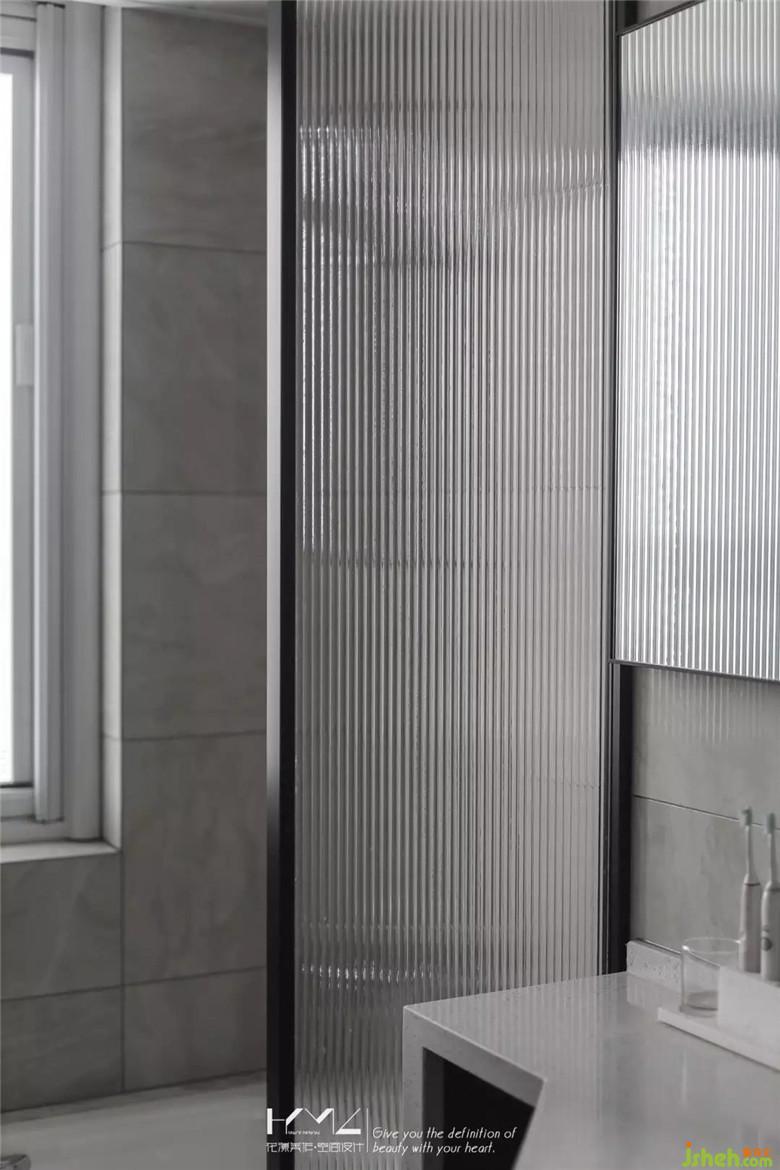 浴缸區(qū)域與臺盆間,裝修公司使用一面長虹玻璃隔斷,最大程度防止水的濺出,同時,長虹玻璃視覺效果更佳,便于打理。