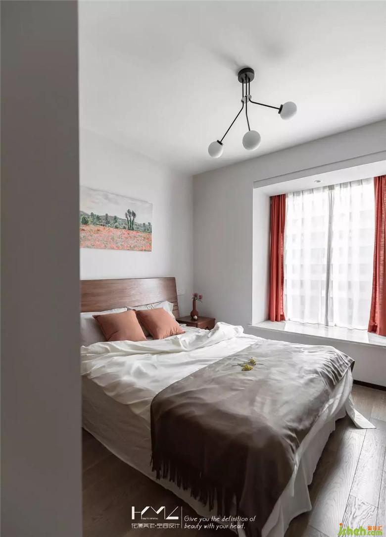 次臥作為老人房,布局與色調(diào)簡約統(tǒng)一,裝修公司搭配了橙紅色窗簾呼應(yīng)整體色彩,背景掛畫與客廳裝飾畫也是異曲同工。