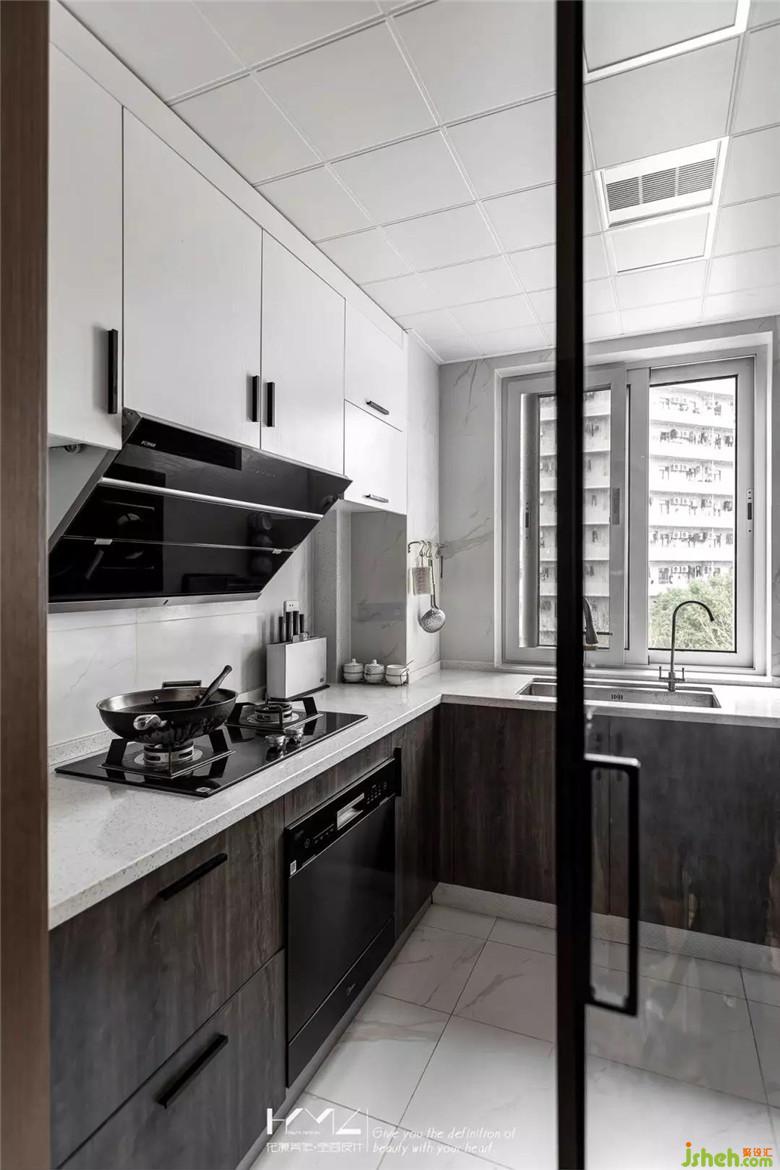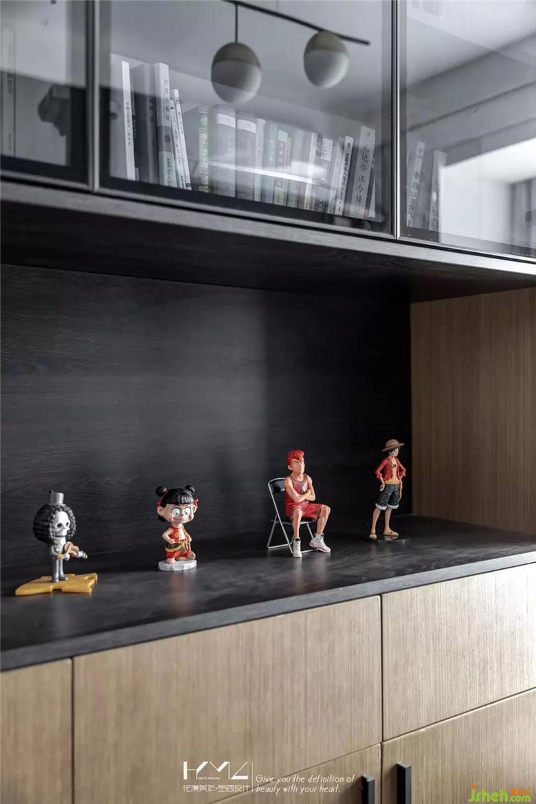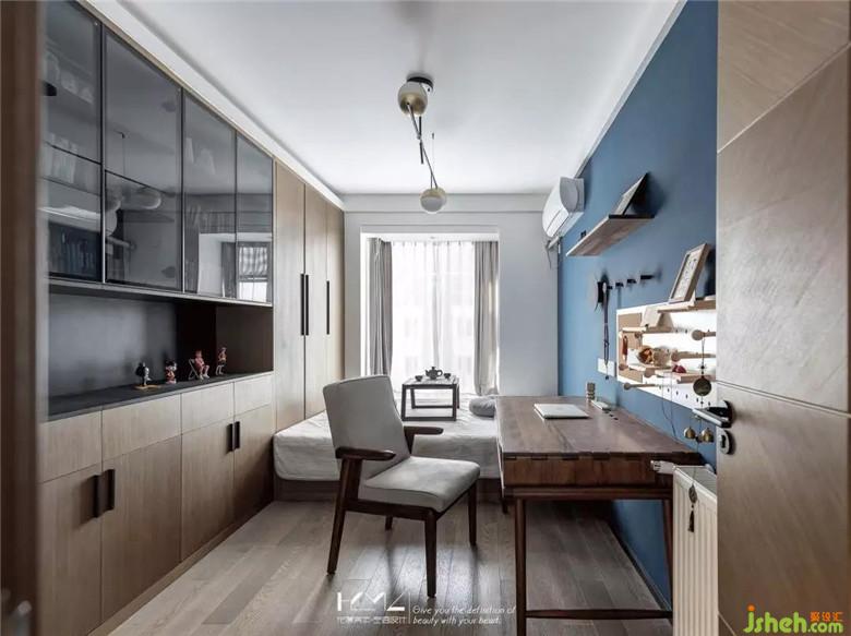 書房一面,書柜、儲物柜與展柜的組合,另一面經(jīng)典藍(lán)色,裝修公司讓空間顯得靜謐悠然。