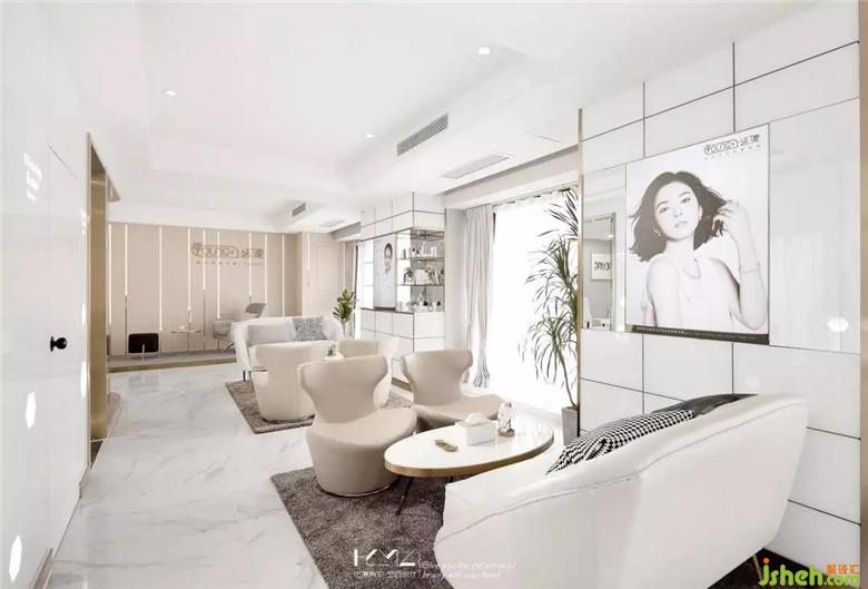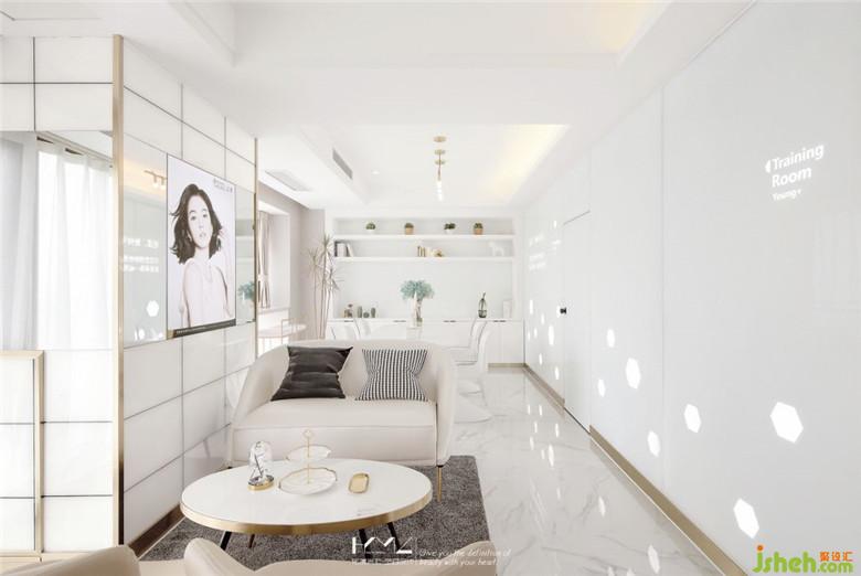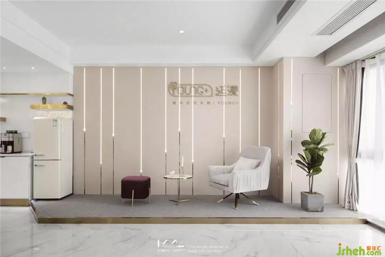 進(jìn)入主接待廳,首先展現(xiàn)的是一面品牌形象墻,裝修公司運(yùn)用kd板與亮面不銹鋼的和led水滴形燈柱的結(jié)合,將原本枯燥的接待過程以夢幻的氛圍呈現(xiàn)。