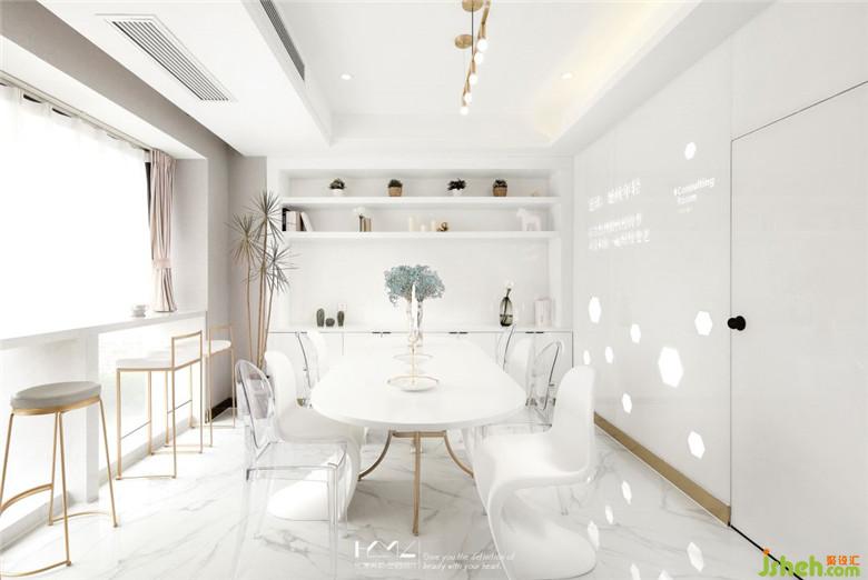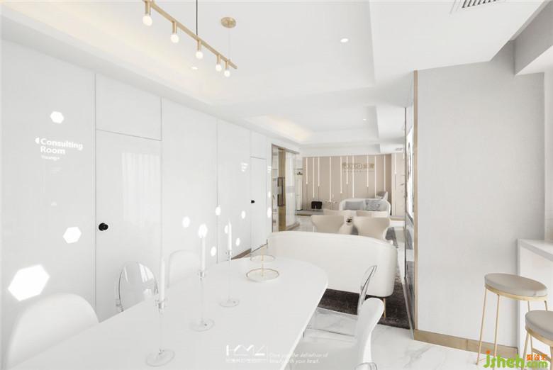 會議區(qū)與接待區(qū)合并在一起,裝修公司將室外美景利用落地玻璃窗引到室內(nèi),室內(nèi)外無過渡的融合,客戶在體驗的同時,我們的技師在這里開會研討,空間的利用更加多元化,超白玻結(jié)合整體燈箱照明在這個墻面也是繼續(xù)延用,整體空間更加完整統(tǒng)一。