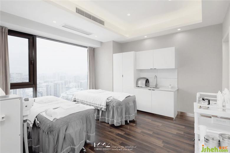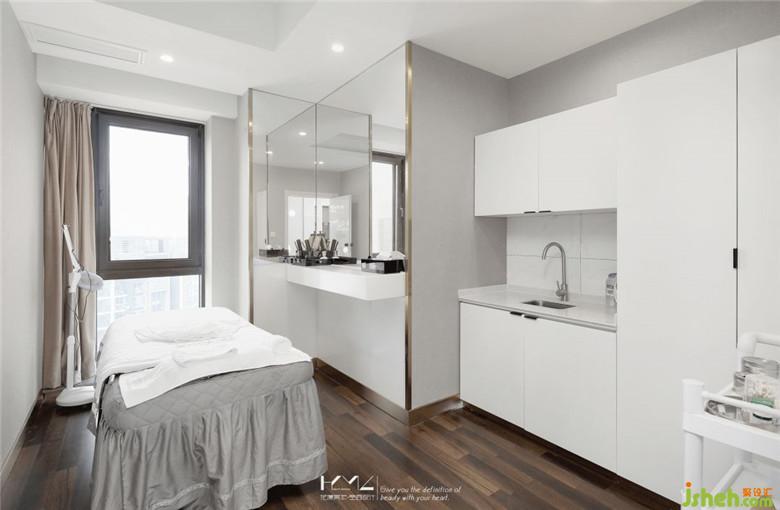 美容包間內(nèi)的氛圍營造上,運(yùn)用了四種材質(zhì),無縫壁布、不銹鋼收邊條及腳線、純白色柜子、胡桃木色地板,輕柔的色調(diào)使空間氛圍恬靜柔美,同時更好的避免了客戶體驗過程中的視覺疲憊感。