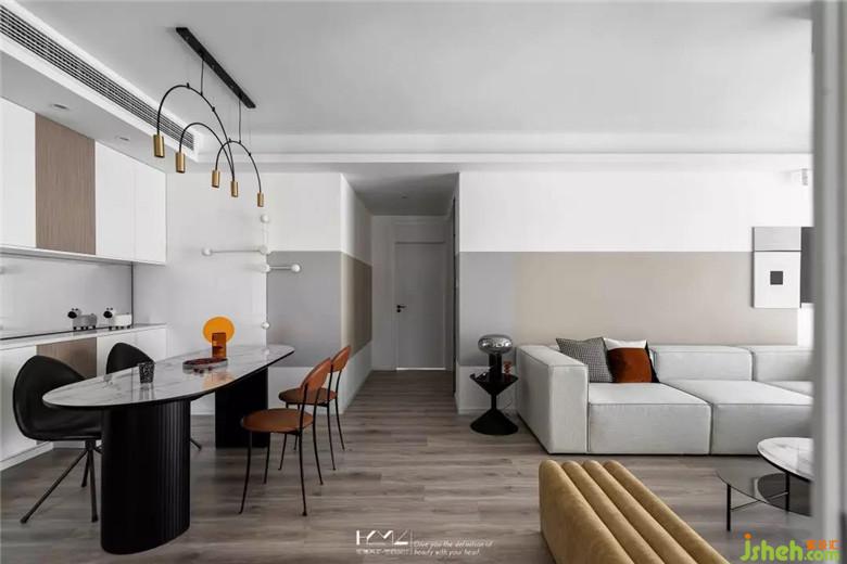 餐廳背景與客廳遙相呼應(yīng),皆用乳膠漆色塊來(lái)裝飾銜接,餐邊柜和入戶右側(cè)的柜門采用木色和白色搭配,與空間整體自然、干凈的氣質(zhì)吻合。黑色搭配橙色的燈具和家具點(diǎn)亮了整個(gè)空間,提升了空間質(zhì)感。