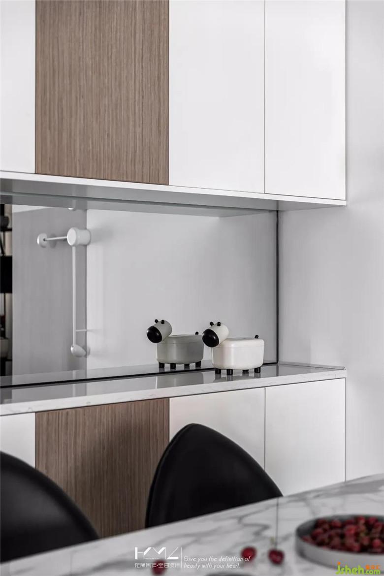柜門無(wú)把手,亞光白與木飾面搭配