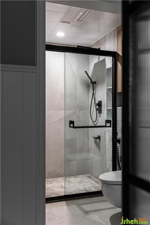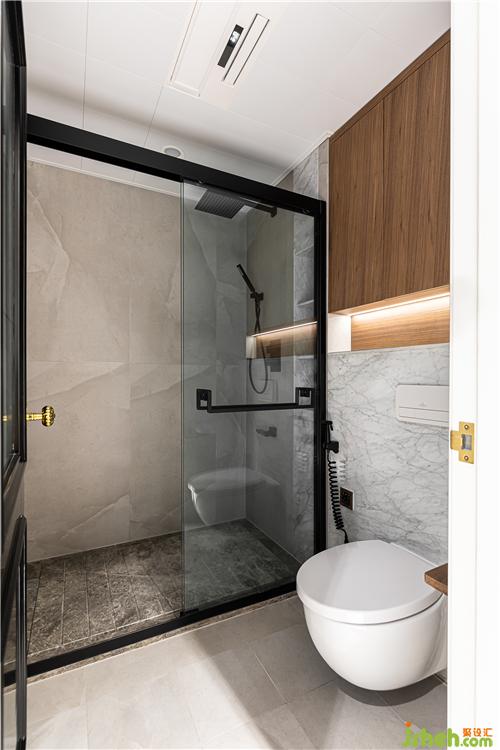 衛(wèi)生間使用易打理的灰色墻地磚、石材,搭配木色柜體,簡約而舒適