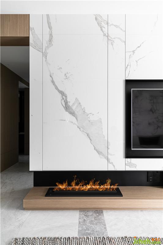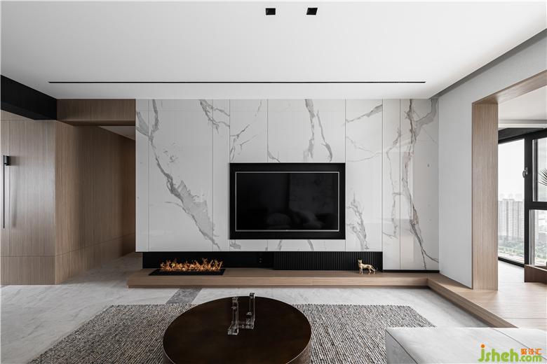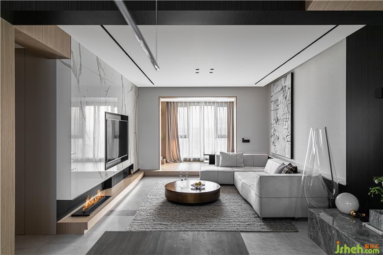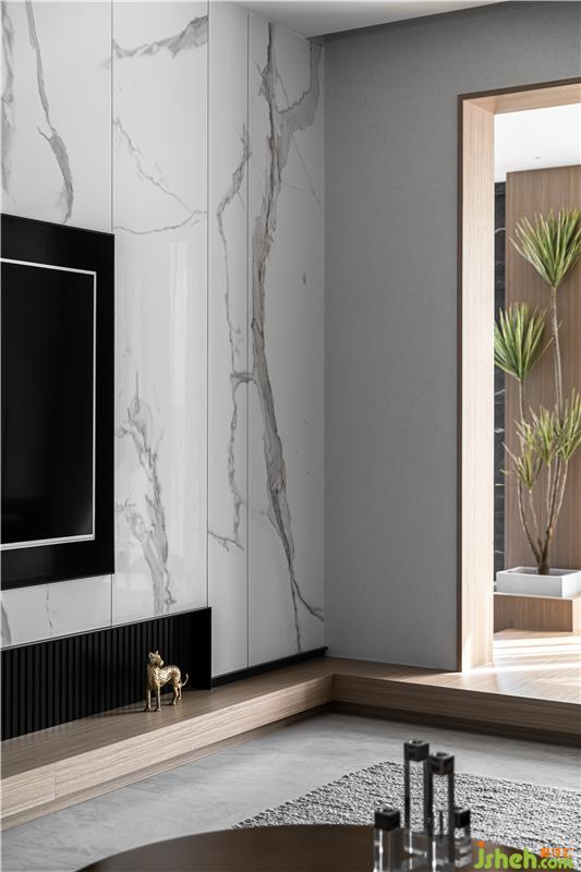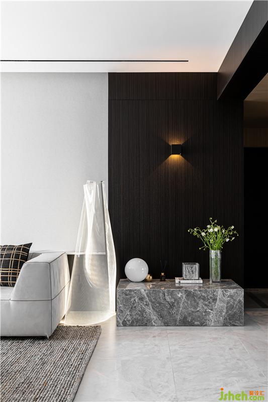 木質(zhì)地臺連接客廳背景與陽臺,地臺下折射暗藏?zé)魩В馁|(zhì)與燈光交錯(cuò)貫穿,一氣呵成構(gòu)建出客廳的儀式感與莊重感。