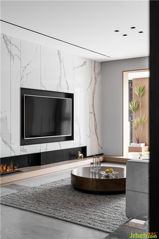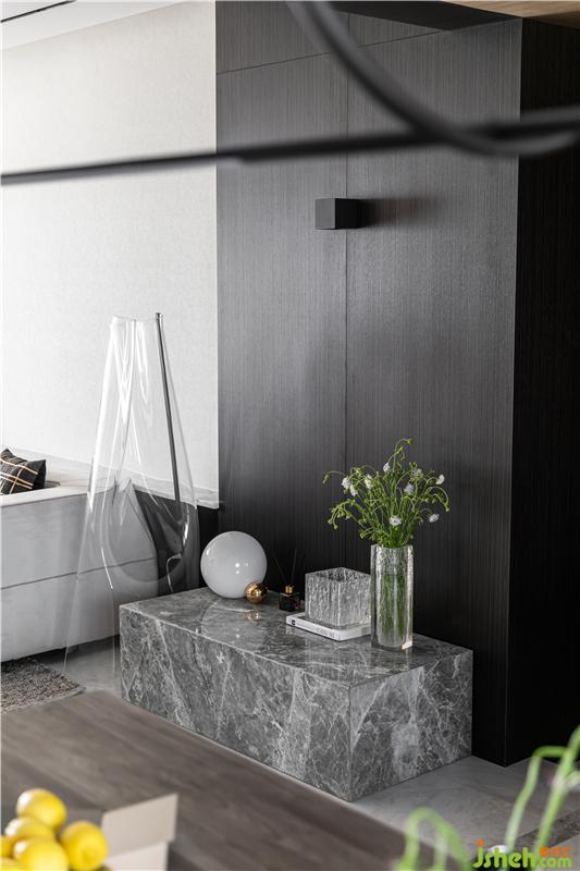 鋁框黑波飾面規(guī)避了收納的雜亂感,杭州家居裝修設(shè)計讓空間呈現(xiàn)出整齊劃一的秩序感和神秘的精致美感。