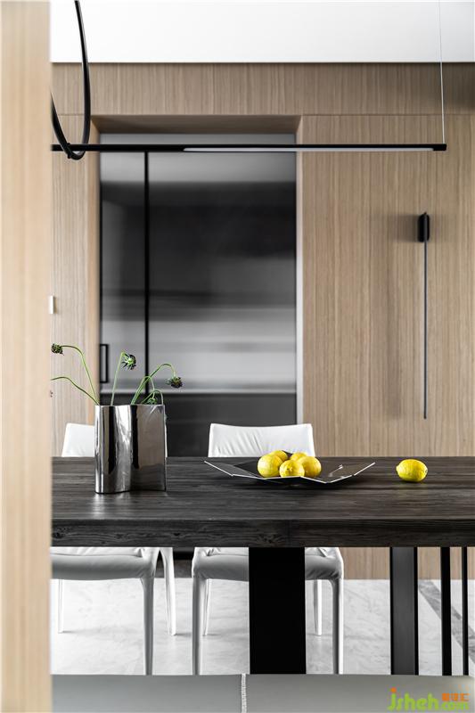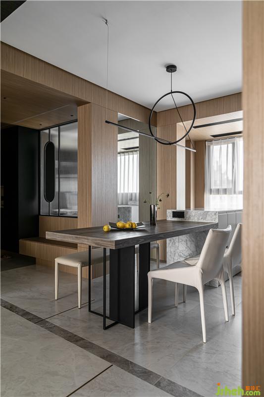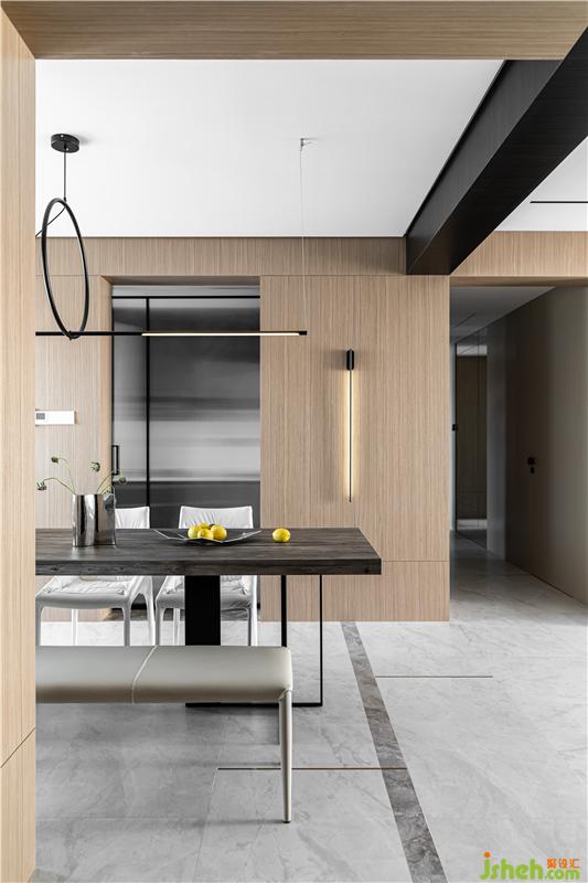 深木飾面包梁,將入戶與餐廳與過道三個區(qū)域進(jìn)行聯(lián)動,弱化空間邊界感。