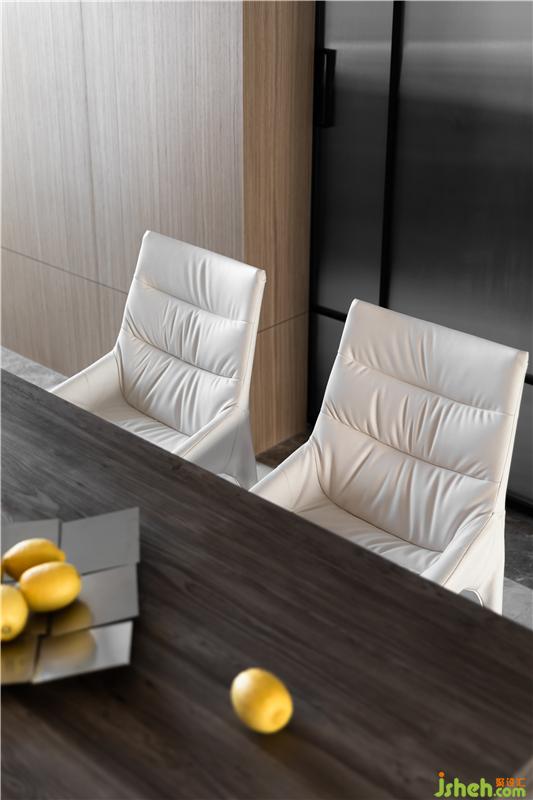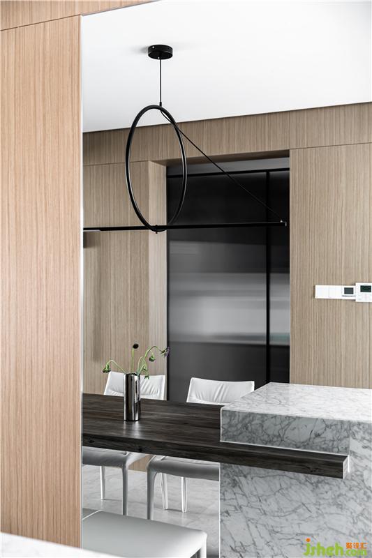 餐桌與島臺一體順延,高低有致,與吧臺區(qū)形成圍合聯(lián)動,擁攬絕佳的視野與采光。