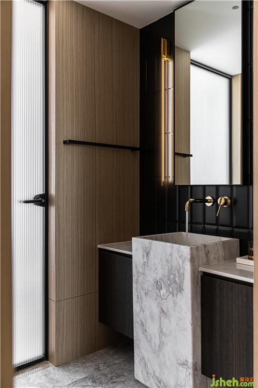 木飾面整體包裹,正面內(nèi)嵌的長條方塊啞光磚,與亮銅壁燈的對稱布局,光影的折射、隱約的紋理,籠罩出一種包容之感,極具視覺張力,暗黑中的優(yōu)雅,更加耐人尋味。
