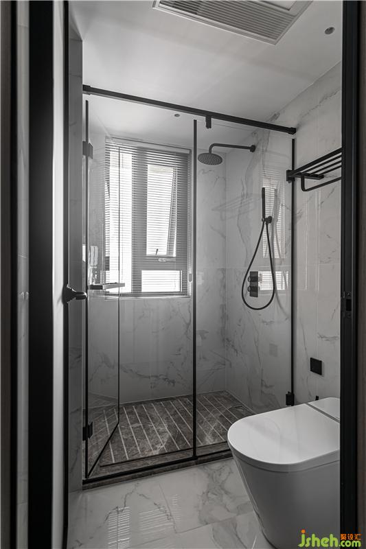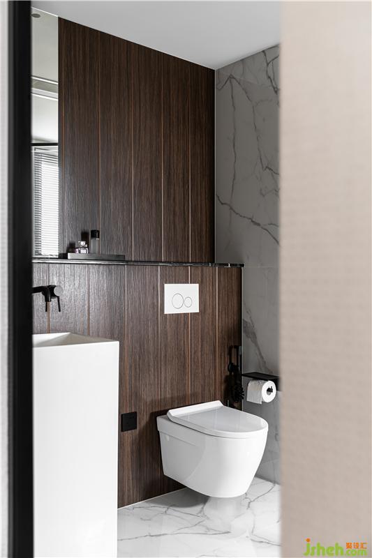 設(shè)計師同樣注重精準(zhǔn)材料推敲,木紋磚與黑色石材的拼接,立柱盆與墻排馬桶錯落布置,無框銀鏡內(nèi)藏了強(qiáng)大的收納功能,門背后預(yù)留了大量的收納區(qū),小空間的立面收納運用到極致。
