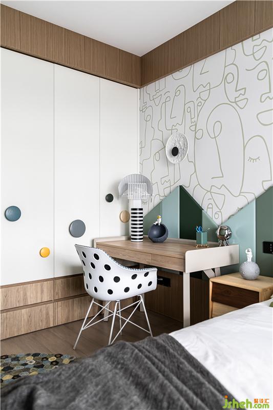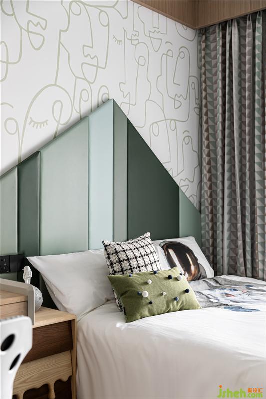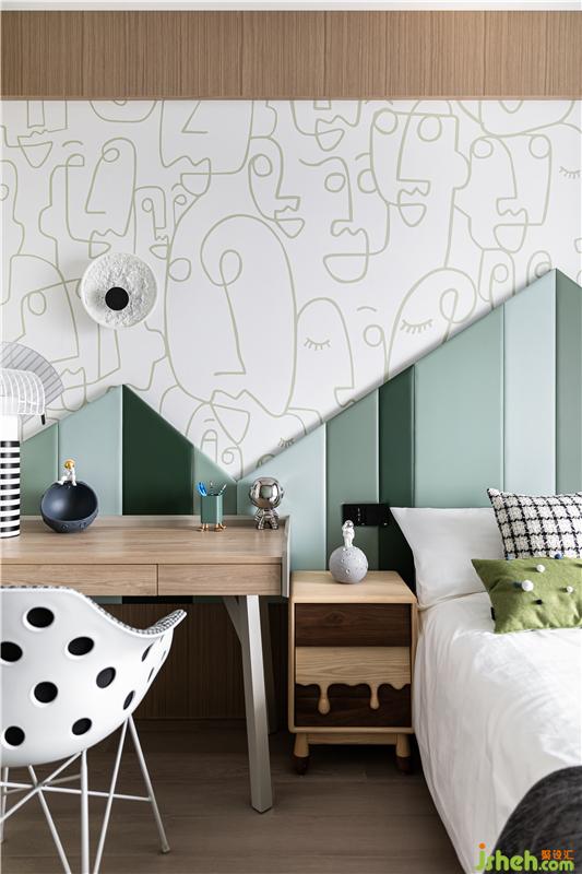 杭州家居裝修設(shè)計為小主人打造了獨立個性的臥室,特別定制的四色硬包拼接,運用房屋造型勾勒趣味邊框,木飾面的運用沿著頂順著墻、為陪伴入眠創(chuàng)造了溫馨的氛圍。