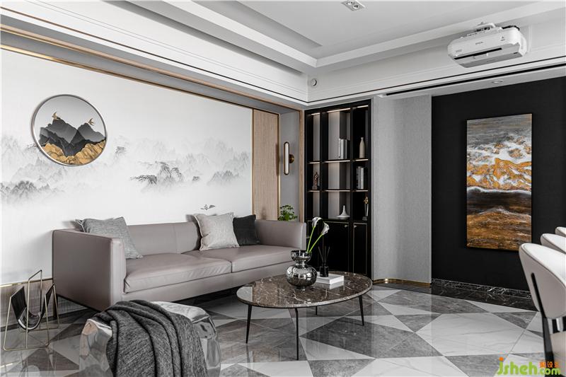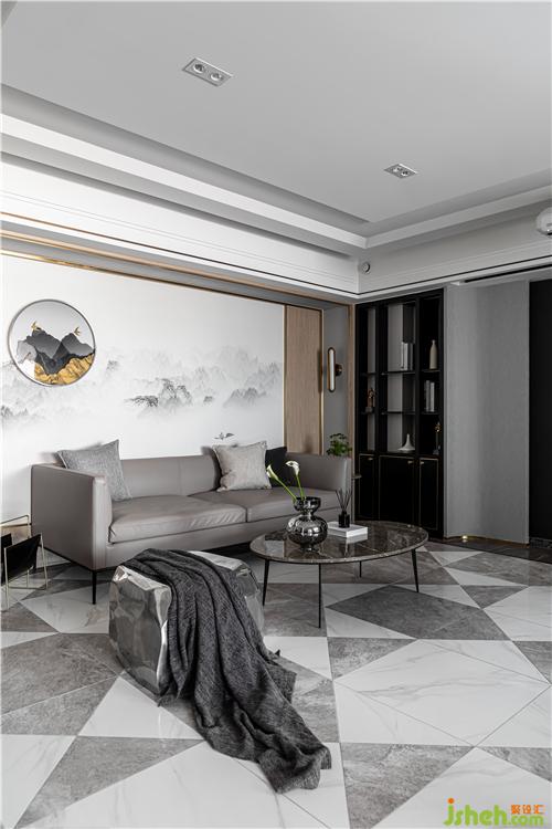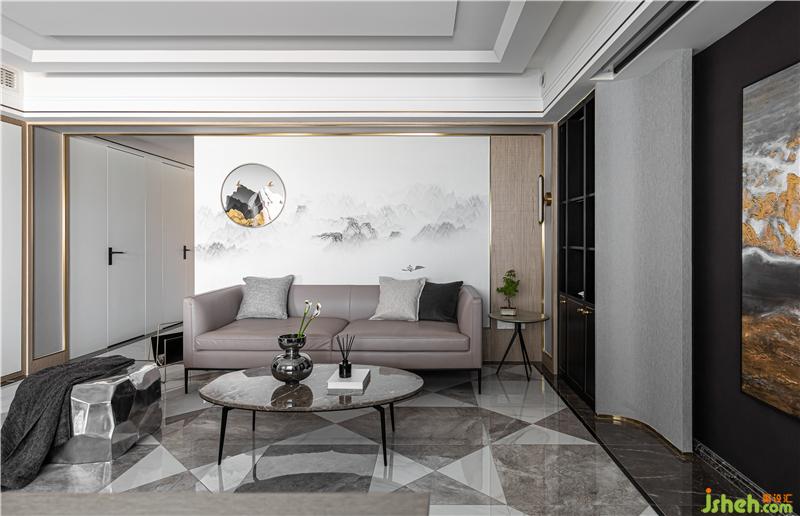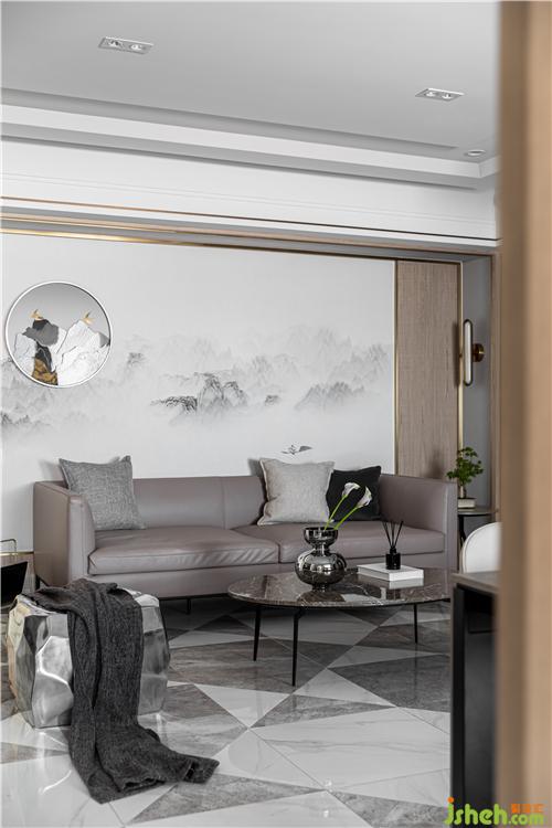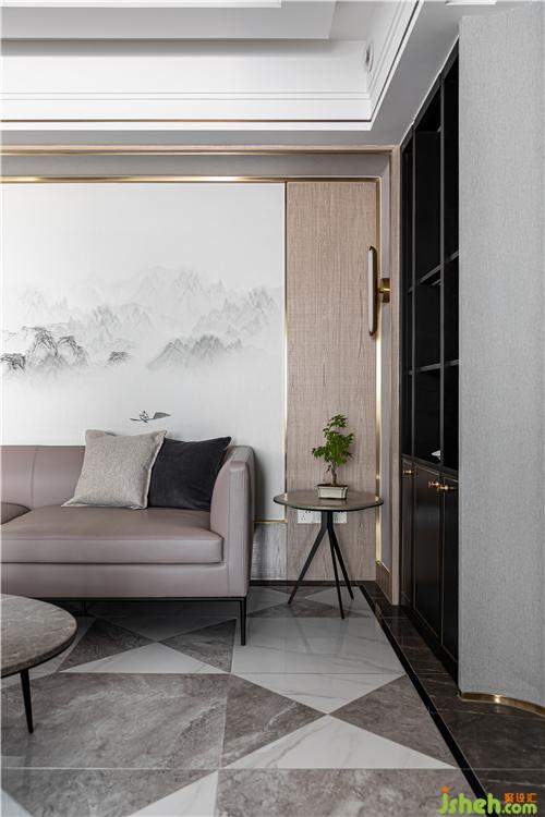 客廳背景室內設計師采用淡淡的中式水墨壁畫,讓柔和的山水與棱角分明的地磚對比更加強烈.