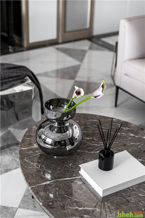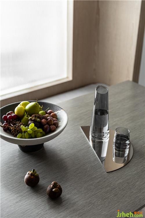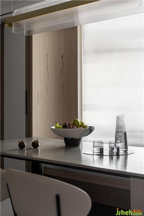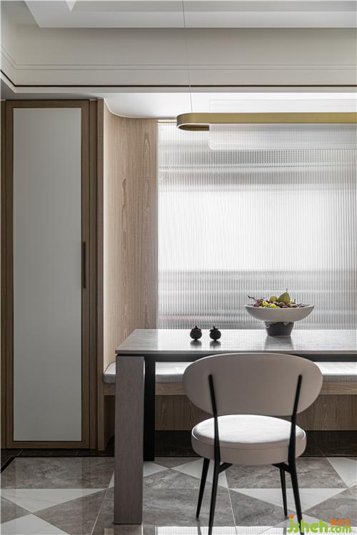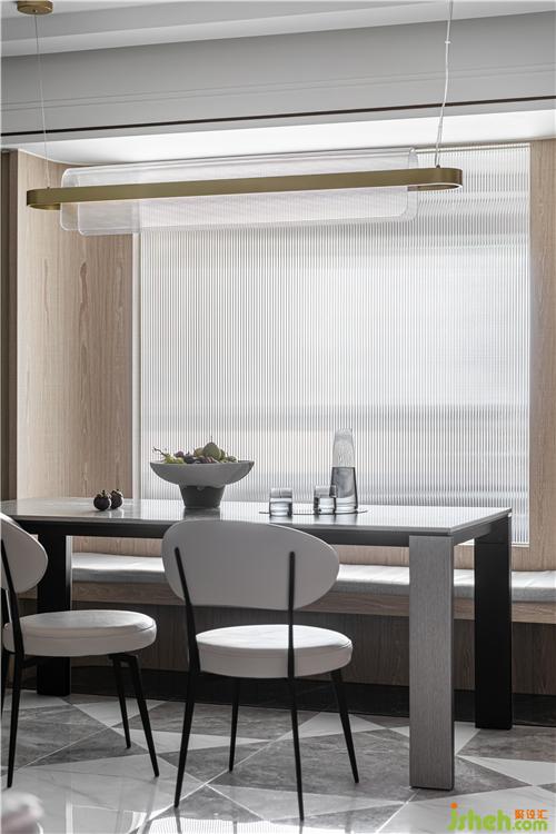 由于狹長(zhǎng)戶型以及臥室位置的局限,客餐廳采光受阻,室內(nèi)設(shè)計(jì)師在餐廳用玻璃隔斷重新組織分區(qū),將光線引入.