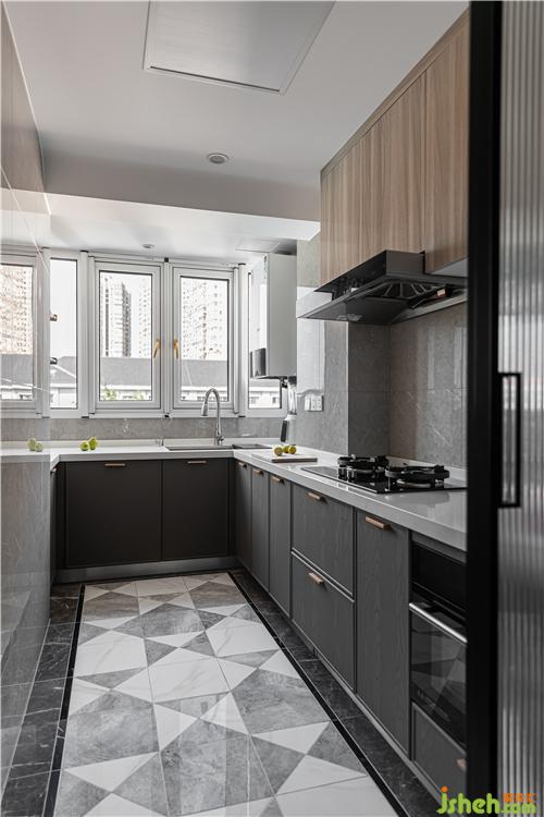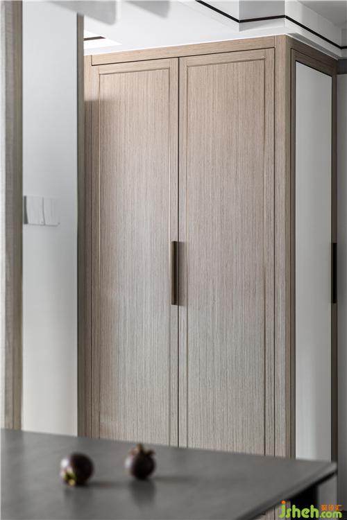 沿用客餐廳地磚的鋪貼形式,虛化狹長(zhǎng)走道的緊湊感,極窄邊框深色柜門與平板木色柜門搭配,盡可能消除瑣碎線條,維護(hù)簡(jiǎn)潔的視覺感受.