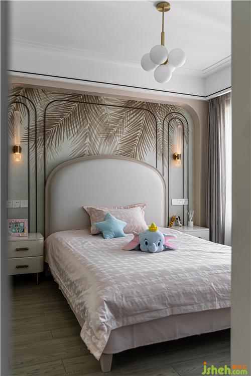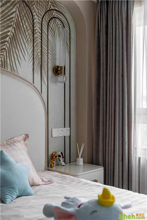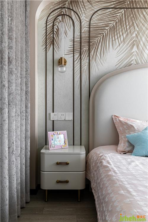 兼?zhèn)涓改阜抗δ埽瑢ΨQ的弧角古銅線條造型,結(jié)合棕色枝葉壁畫墻紙,既雅致大方又充滿童趣.