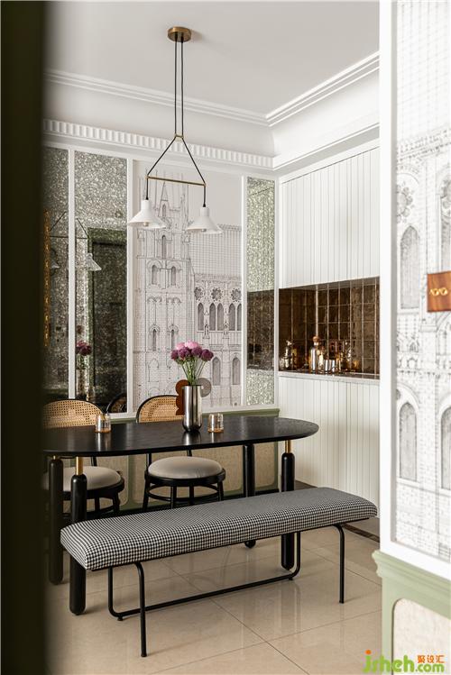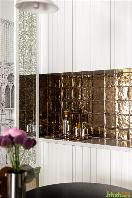 入戶右側(cè)乳白色餐邊柜搭配金屬釉面磚,個性又復古.