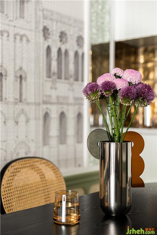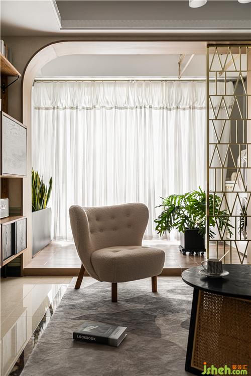 客餐廳一個空間一脈相承,胡桃木質(zhì)感的定制展架與與灰豆綠的護墻融合,室內(nèi)設計師輕熟風的電影場景應運而生,墨綠色絨布沙發(fā)觸感細膩柔軟,呼應了空間主色調(diào)綠色,銅隔斷和草編茶幾碰撞出復古混搭的格調(diào).柔軟的透光紗簾,沉淀了空間的氣質(zhì).