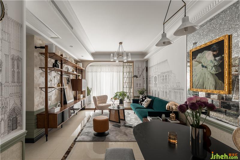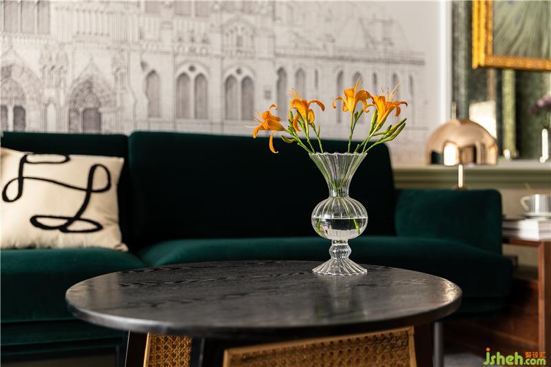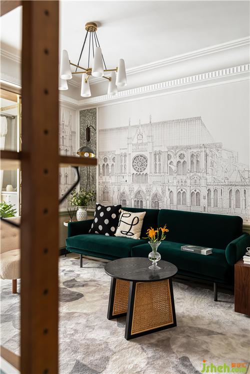 A continuous space in the living room, the walnut-wood customized exhibition frame and gray-bean Green Wall integration, light familiar with the wind of the movie scene came into being, Dark Green Velvet Sofa touch delicate soft, should be the main color of the space tone green, copper partition and straw-made coffee table collision out of the old-fashioned mix style. Soft transparent gauze curtain, precipitation of the space temperament.