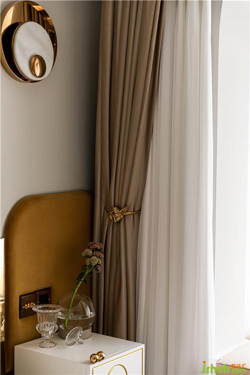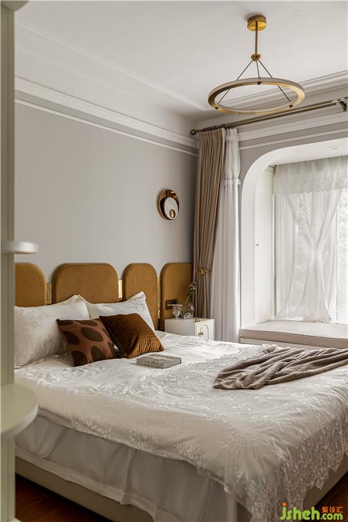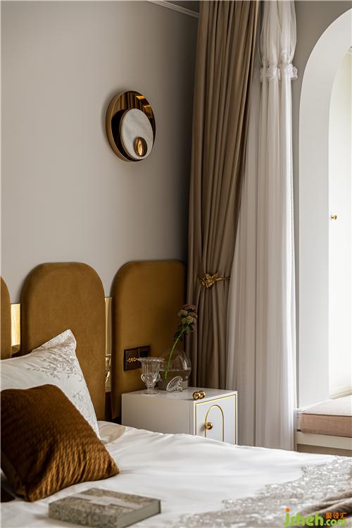 Master bedroom overall tone and big space is completely different, the overall tone is romantic, elegant, with light gray as the ground color, the background is embellished orange, split up and down, the wall skirt uses the same wallpaper as the living room, the wall lamp, the table lamp is arranged asymmetrically, lace printed curtains and bedding add a retro taste, delicate texture will be elegant romantic temperament reflect incisively and vividly.