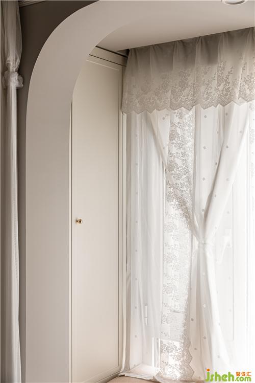 蕾絲與白紗組成的床品及窗簾營造了空間的浪漫與優(yōu)雅氣質(zhì).