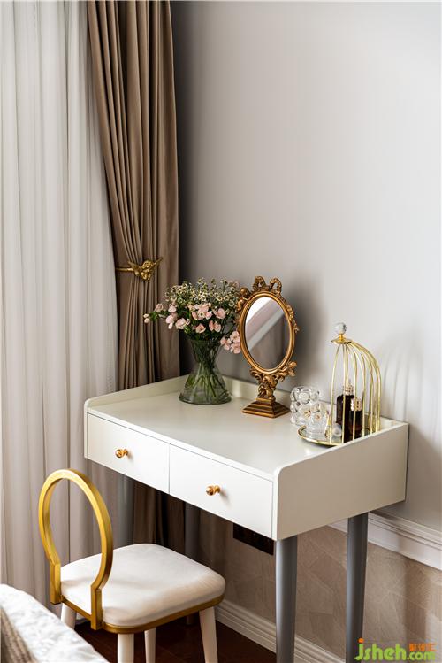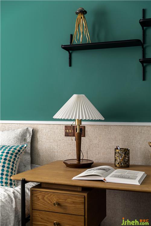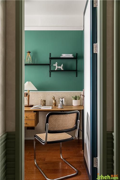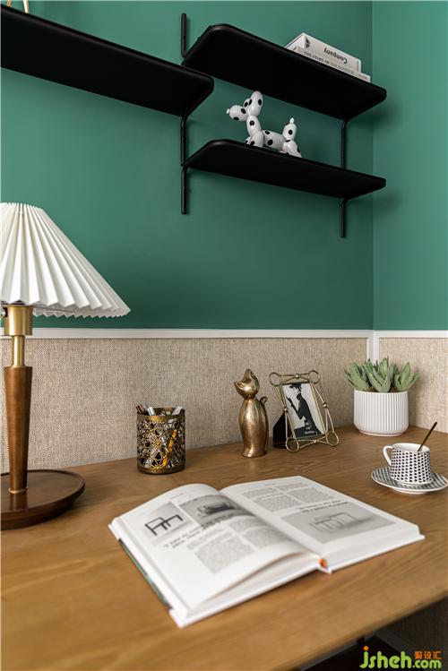 The overall tone of the study is more stable, green with walnut makes the space filled with a little retro flavor, functionally combined with the study and rooms and storage space co-use, ARC concave and convex door plate combined with woven texture wallpaper, combined use, large Dark blue-green Latex paint shop, so that a small space better integration in the whole retro-style home.