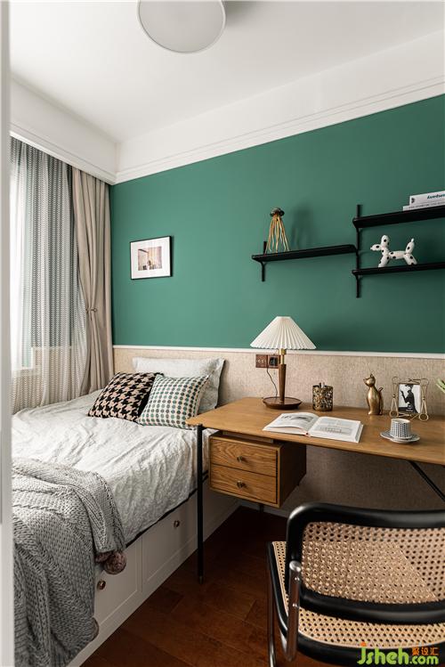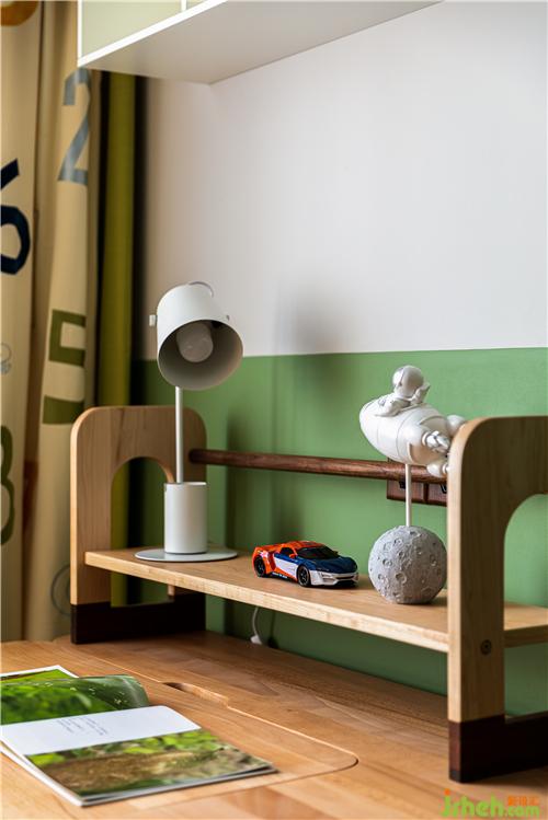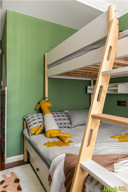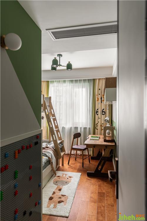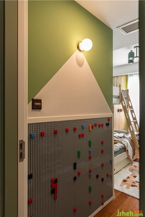 兒童房入口的樂(lè)高墻供孩子玩耍,鍛煉孩子的動(dòng)手能力,墻上涂刷的綠色房子造型為精心設(shè)計(jì),原木色的家具皆為圓角設(shè)計(jì),保證了孩子的安全,牛油果綠色調(diào)的空間軟硬裝搭配充滿童趣,跳脫的黃色與橙色豐富了空間色彩.