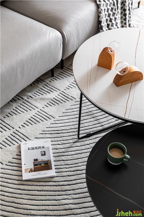 客廳的布局落落大方,淺灰色的沙發(fā)搭配淺色條紋地毯以及圓形高低茶幾,使空間溫暖而又不失格調(diào).
