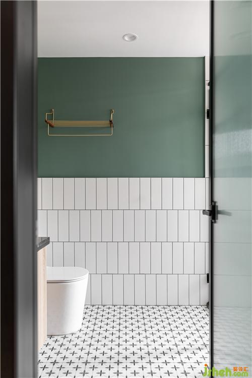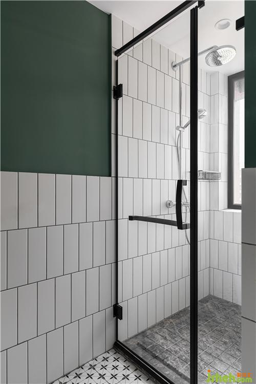 空間局限,只有淋浴房內(nèi)有采光.地面和墻面大面積的白磚鋪貼,讓空間更干凈明亮, 半墻磚半乳膠漆的設(shè)計(jì)減少單調(diào)給空間注入一絲活力.