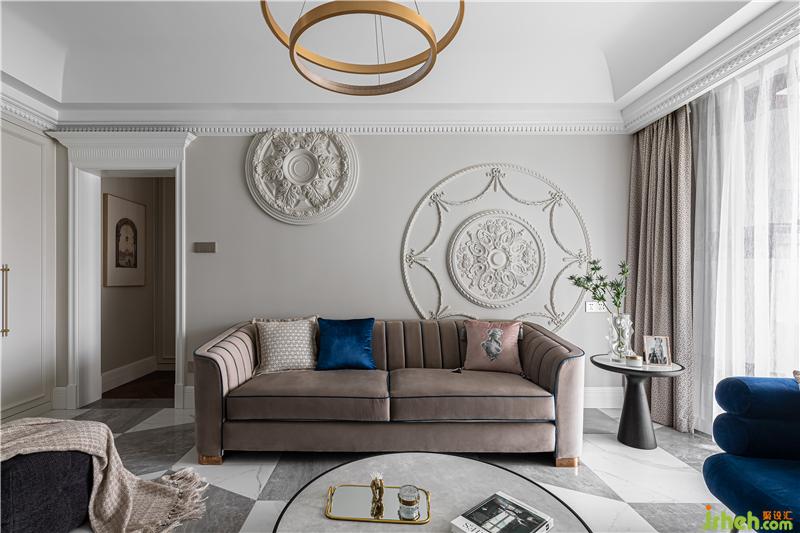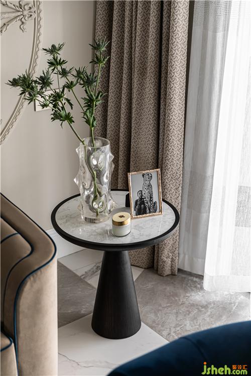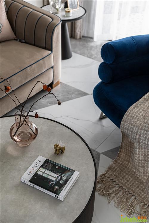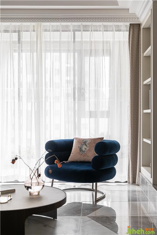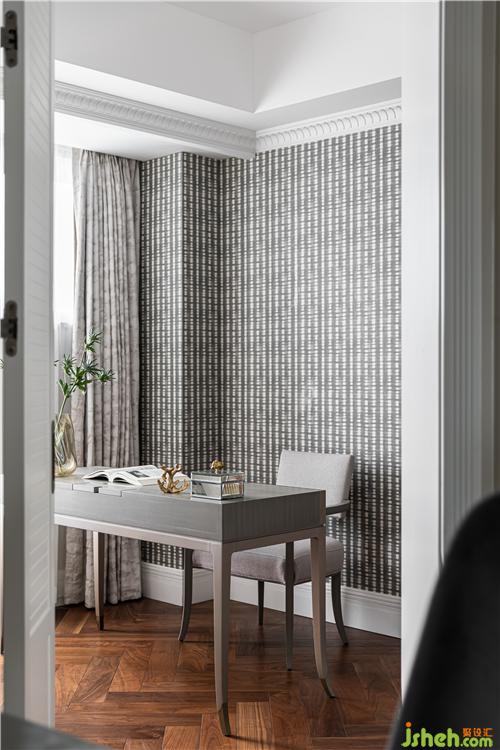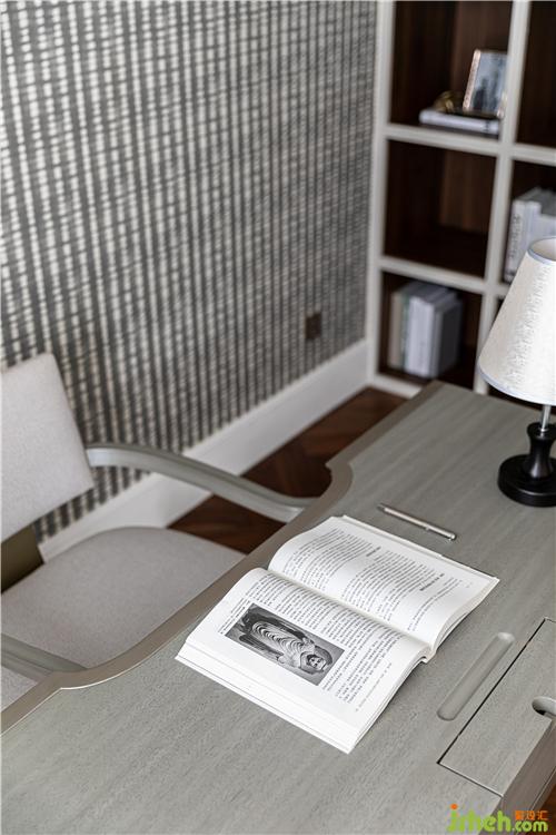 進(jìn)口斑點(diǎn)圖案壁紙、人字拼地板、陣列排布的書架,呈現(xiàn)出一種秩序之美;書架采用奶油色烤漆封板對(duì)胡桃木柜體進(jìn)行分割, 打破木色的厚重感;窗簾、書桌、書椅以優(yōu)雅的灰色調(diào)為主,營(yíng)造沉靜復(fù)古的書房氛圍.