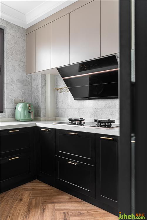 廚房地面采用胡桃木色木紋磚,地柜延用餐邊柜的黑色烤漆門板,點綴黃銅拉手;香檳色吊柜門板增添幾分時尚與溫馨.