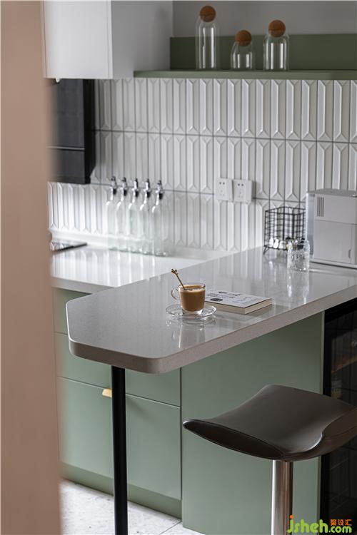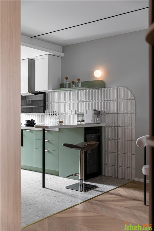 開放式的廚房增加空間聯(lián)動性,半墻磚的鋪貼方法延續(xù)到了吧臺區(qū)域,墻磚、地磚與地板的拼接也隱性的劃分了廚房和餐廳空間,看似相連卻又功能分明.