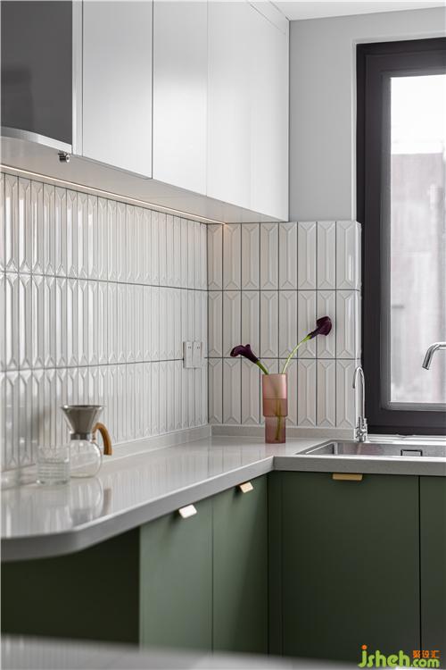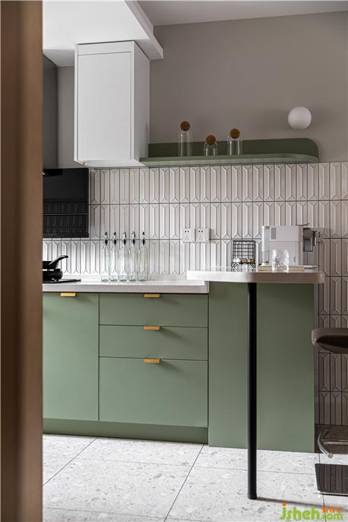廚房的灰綠色沿用在護(hù)墻上,增加視覺聯(lián)動性,藤編元素的融入彰顯空間的柔和氣質(zhì).
