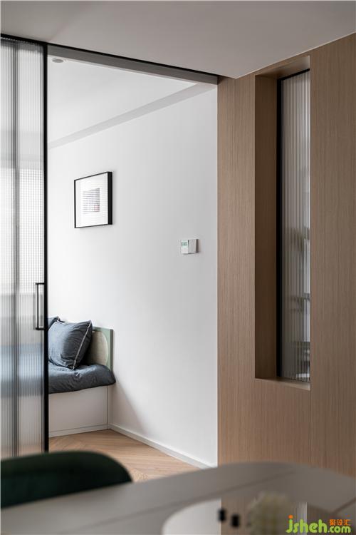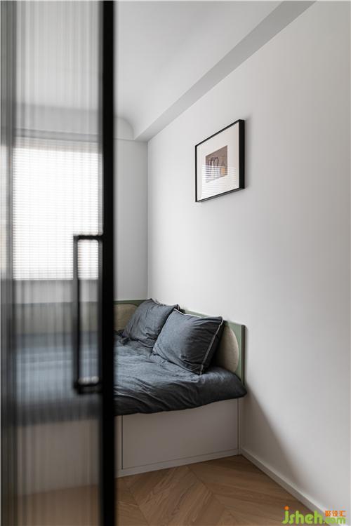 次臥的設(shè)計(jì)較為簡潔,為了最大程度的保證自然光照,設(shè)計(jì)三門聯(lián)動,選用超白長虹磨砂玻璃,透光不透影,既保證采光又保護(hù)隱私,空間整體搭配明亮柔和